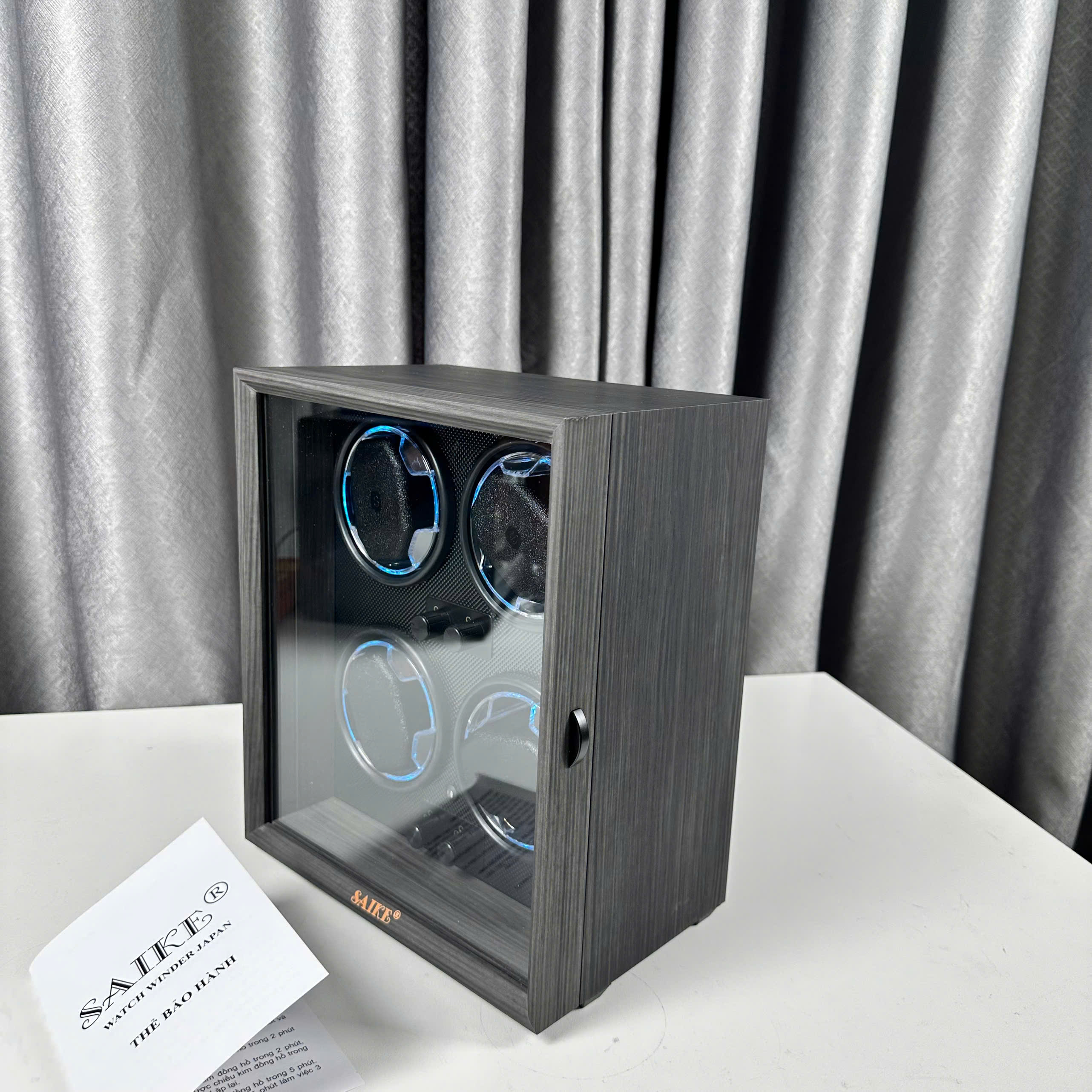 Thông tin sản phẩm: Hộp Xoay Đồng Hồ Cơ 4 Ngăn SAIKE S4001 Vỏ Gỗ - Có Đèn LED - SANG TRỌNG - Chất liệu: thân phôi là gỗ MDF, bảng bên trong là ABS