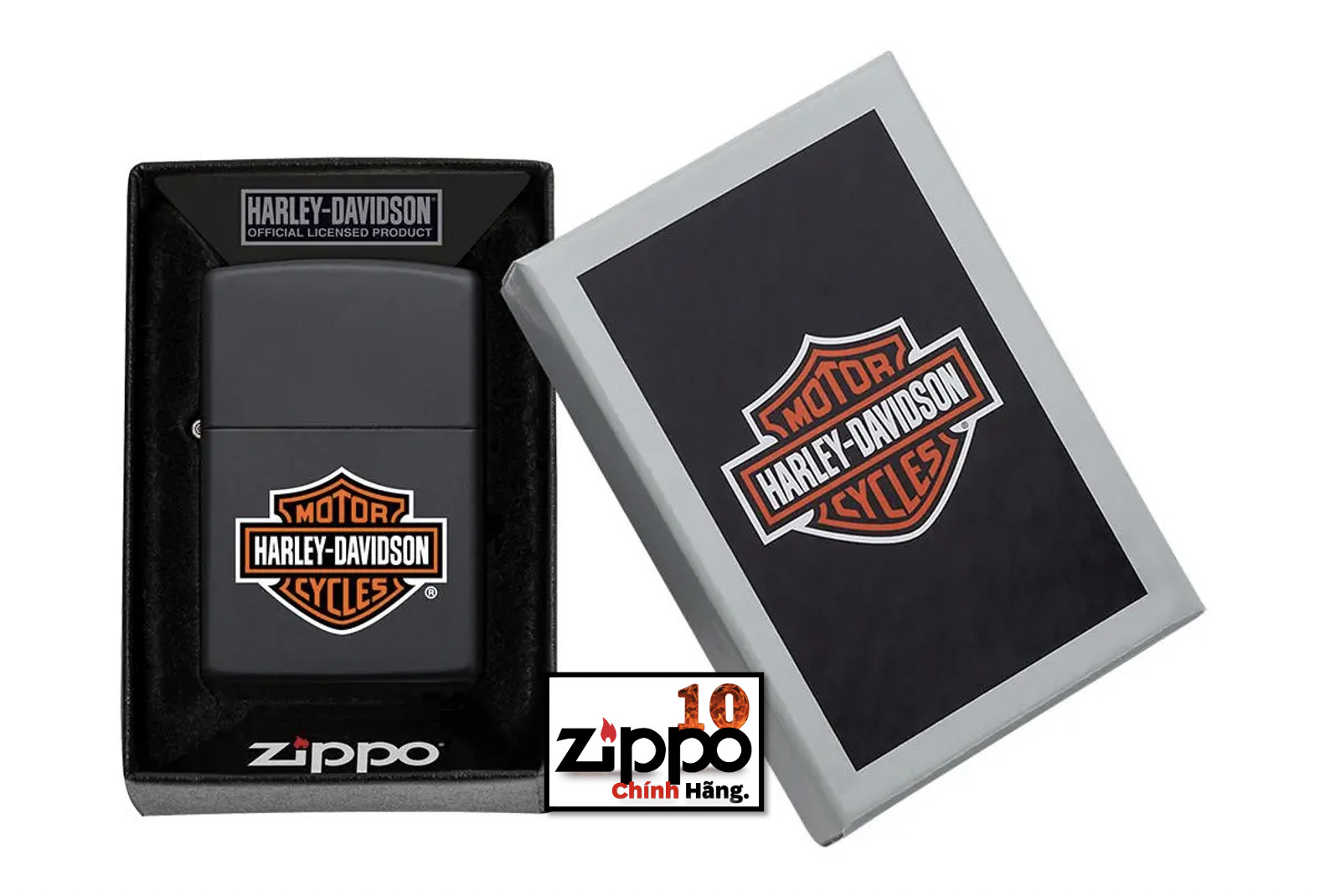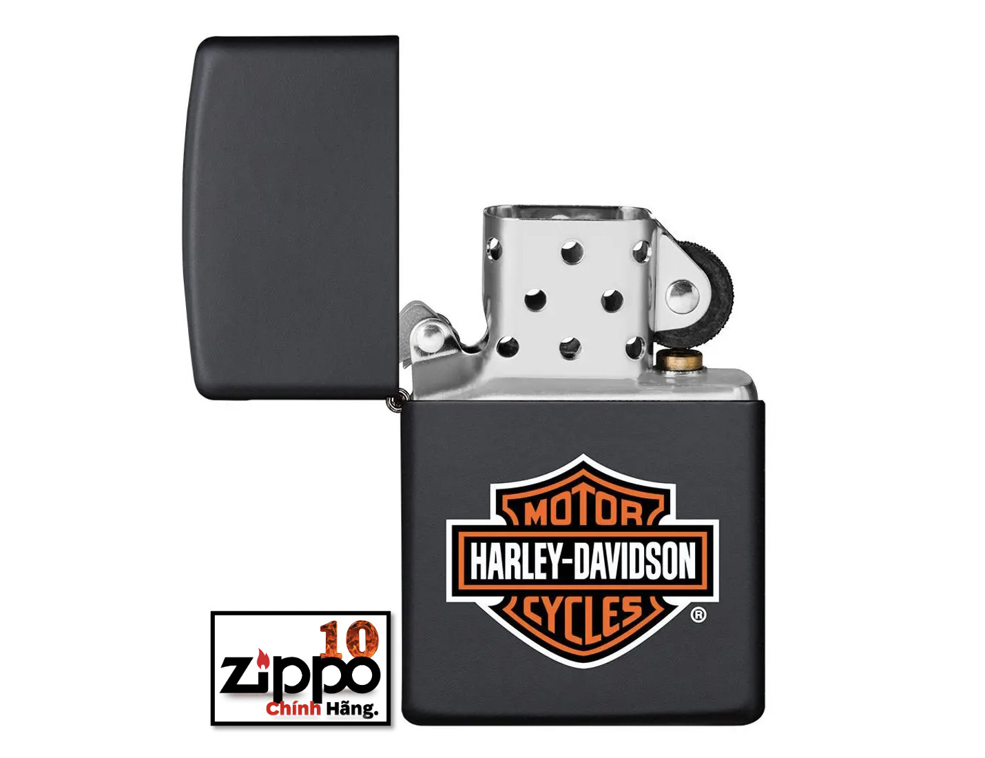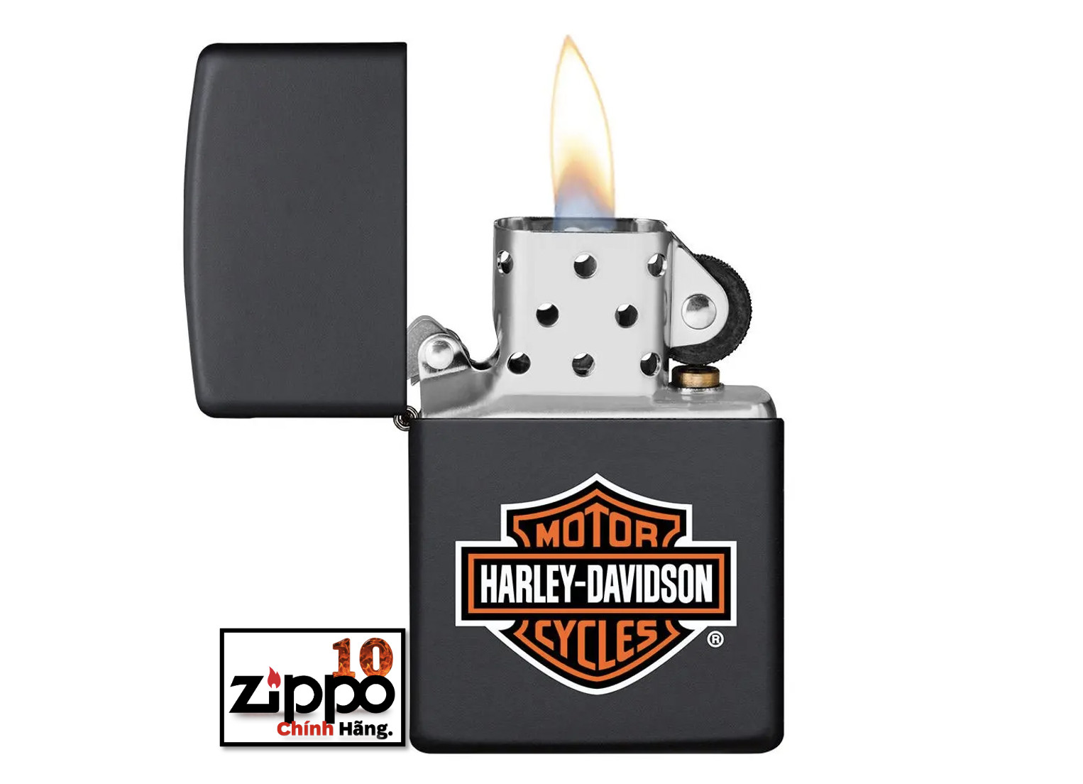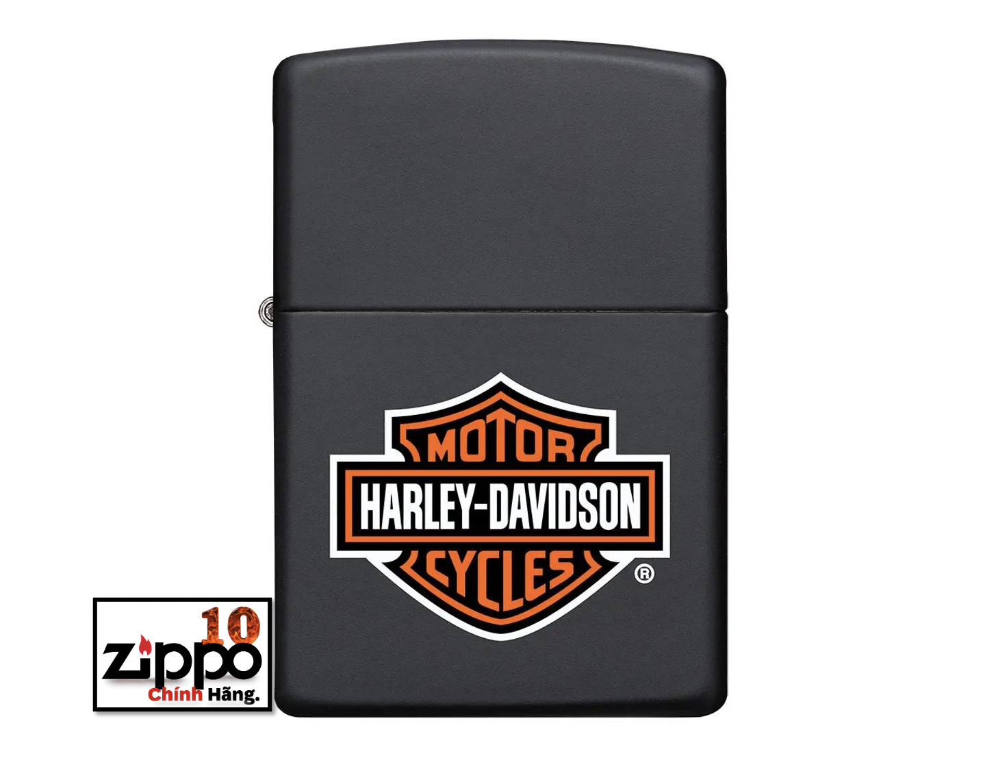 Zippo Harley Davidson Logo Black Matte là bật lửa chất liệu vỏ đồng thau, phủ sơn tĩnh điện đen và in trang trí logo Harley-Davidson mặt trước.