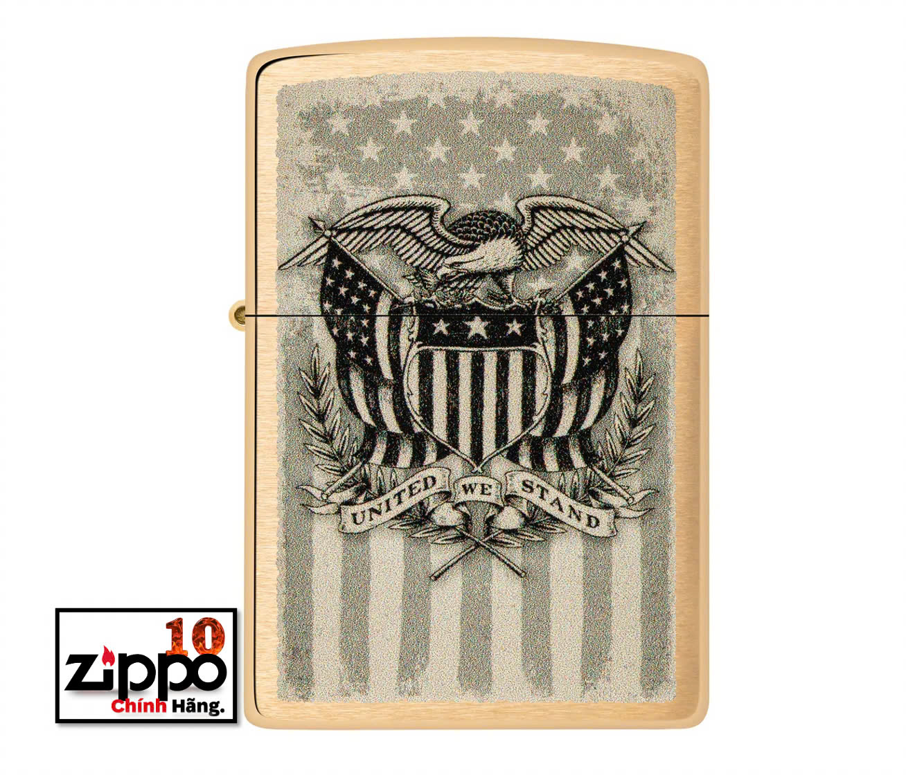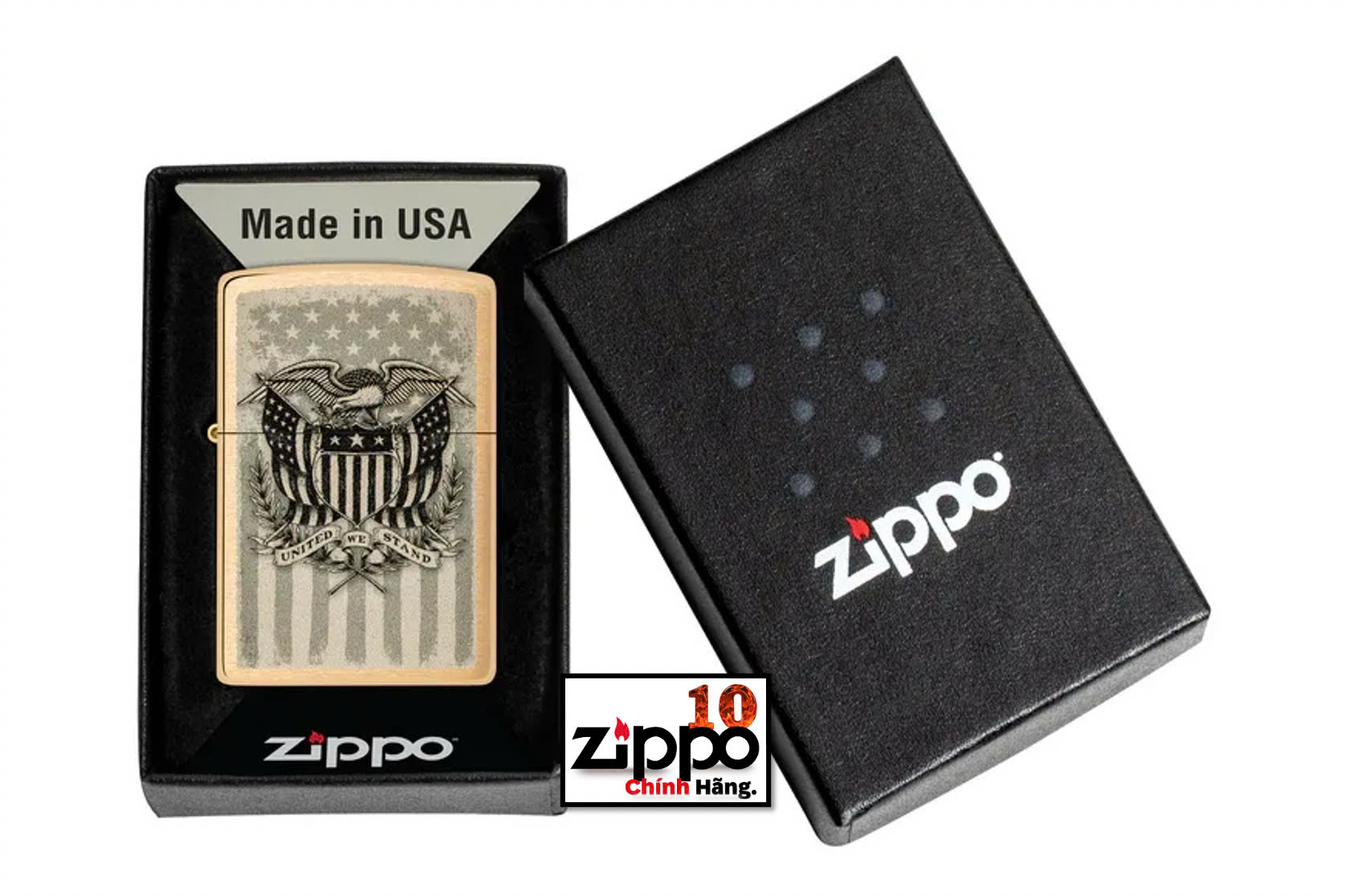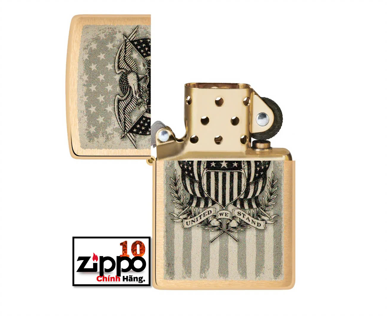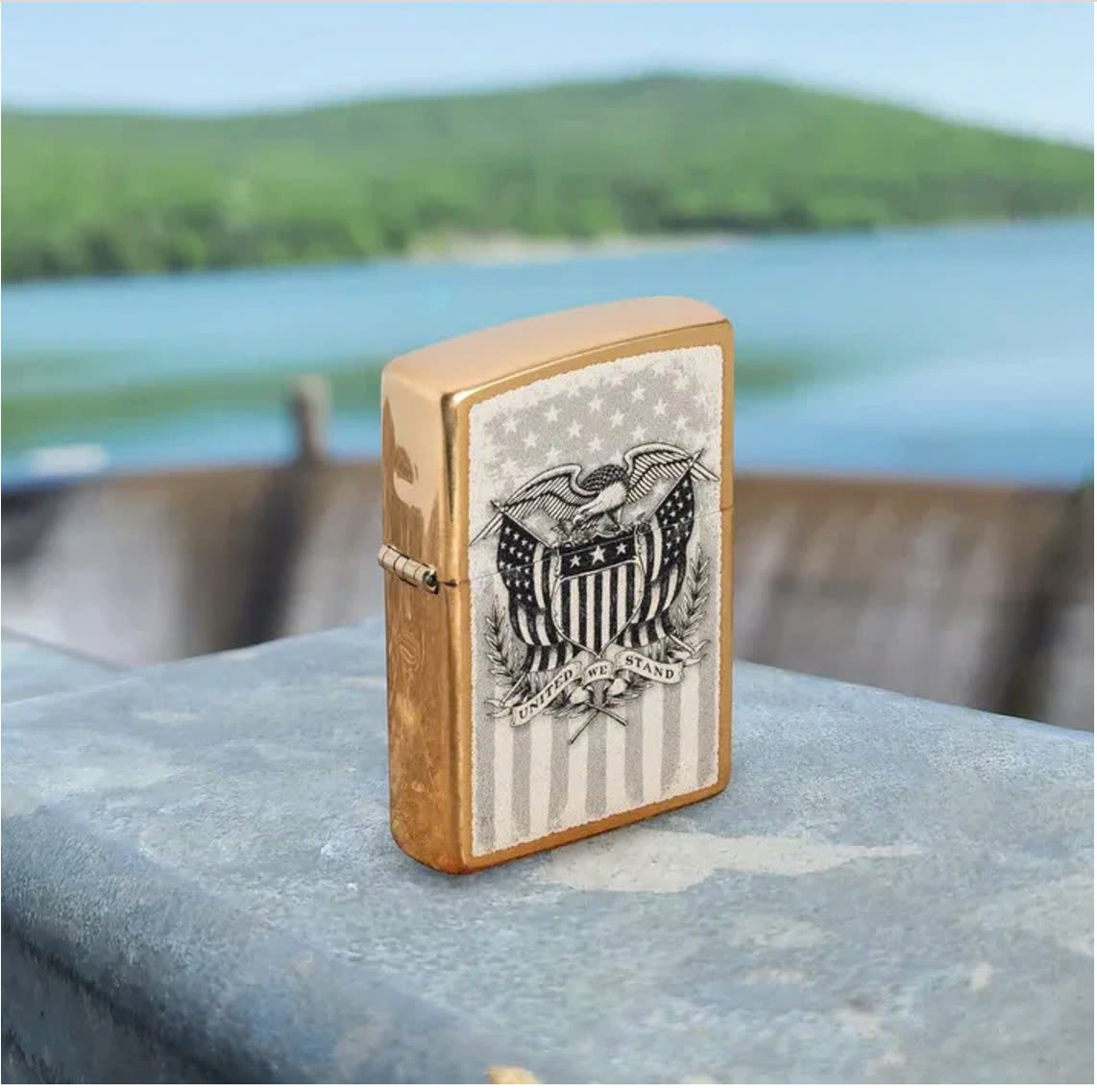 Chiếc bật lửa Brushed Brass cổ điển này toát lên tinh thần yêu nước. Thiết kế Color Image tông màu nâu đỏ có huy hiệu phức tạp với dòng chữ "United We Stand" trên nền cờ Mỹ tinh tế. Được đóng gói trong hộp quà tặng. Để có hiệu suất tối ưu, hãy đổ nhiên liệu bật lửa Zippo. Bật lửa chống gió Zippo chính hãng với tiếng “click” đặc trưng của Zippo.