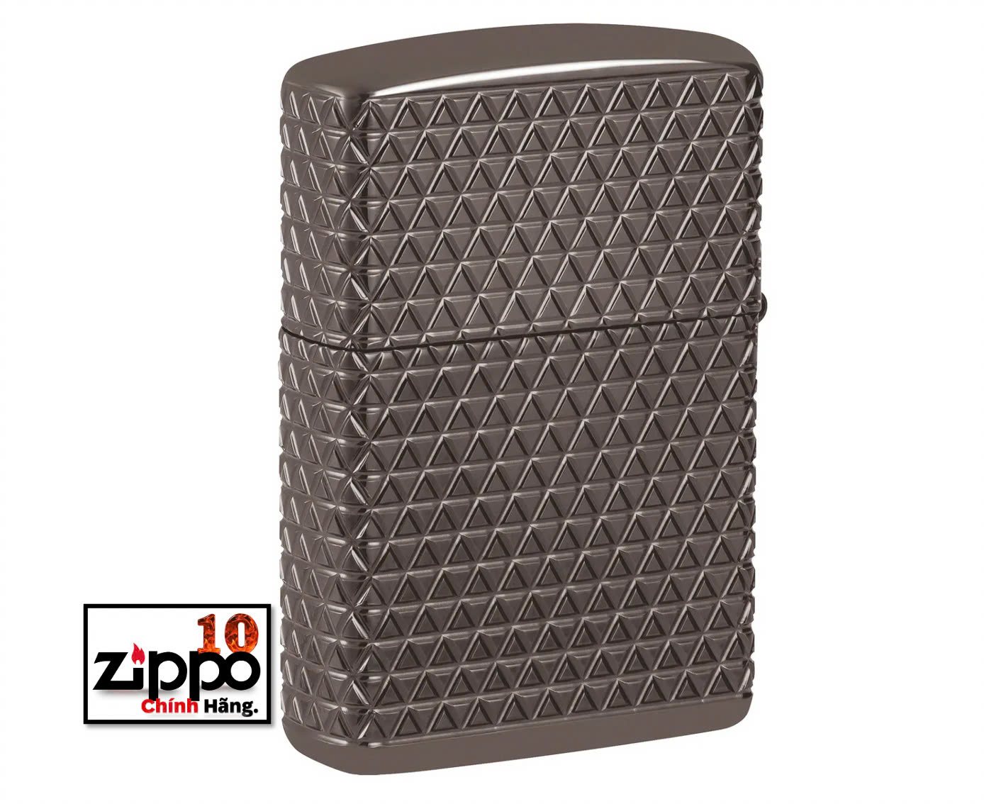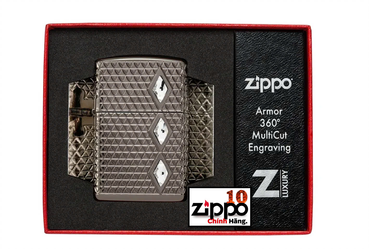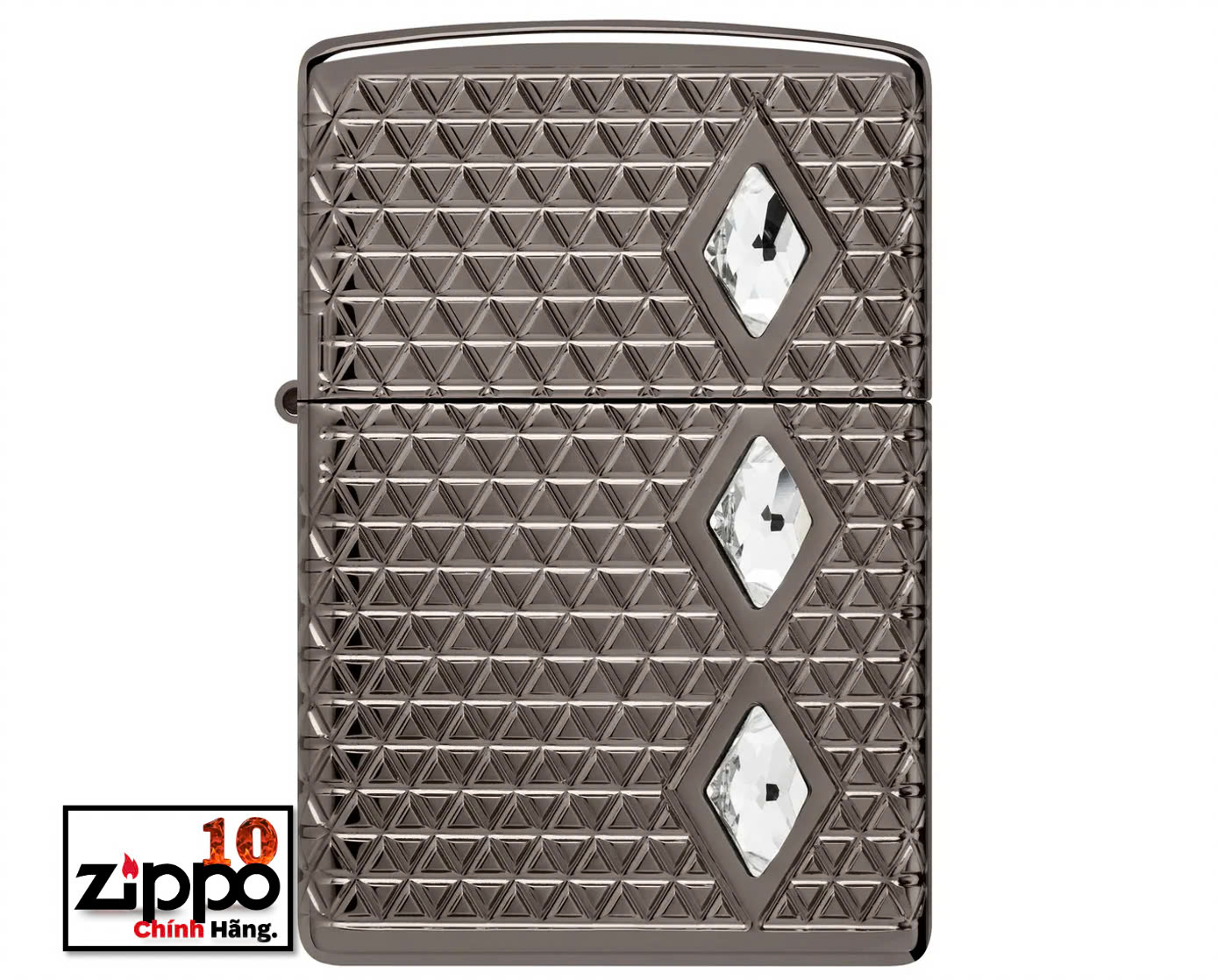 Được bao quanh bởi họa tiết kim cương MultiCut thanh lịch, ba viên pha lê lấp lánh lấp lánh trên bề mặt của chiếc bật lửa Armor Black Ice tinh xảo này. Được đóng gói trong một hộp quà tặng và kèm theo hướng dẫn sử dụng. Để có hiệu suất tối ưu, hãy đổ nhiên liệu bật lửa Zippo.