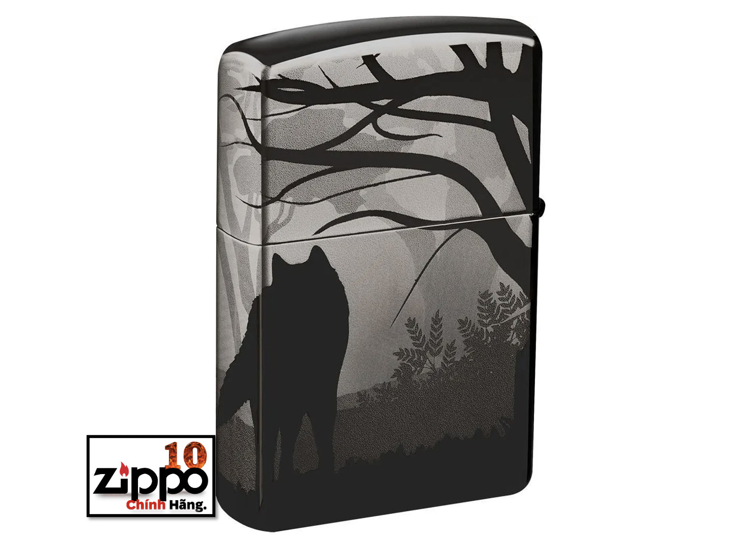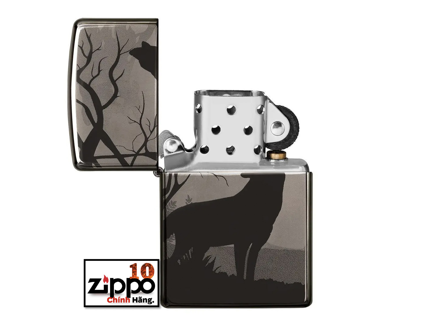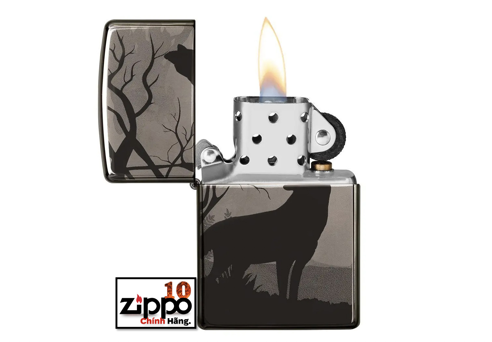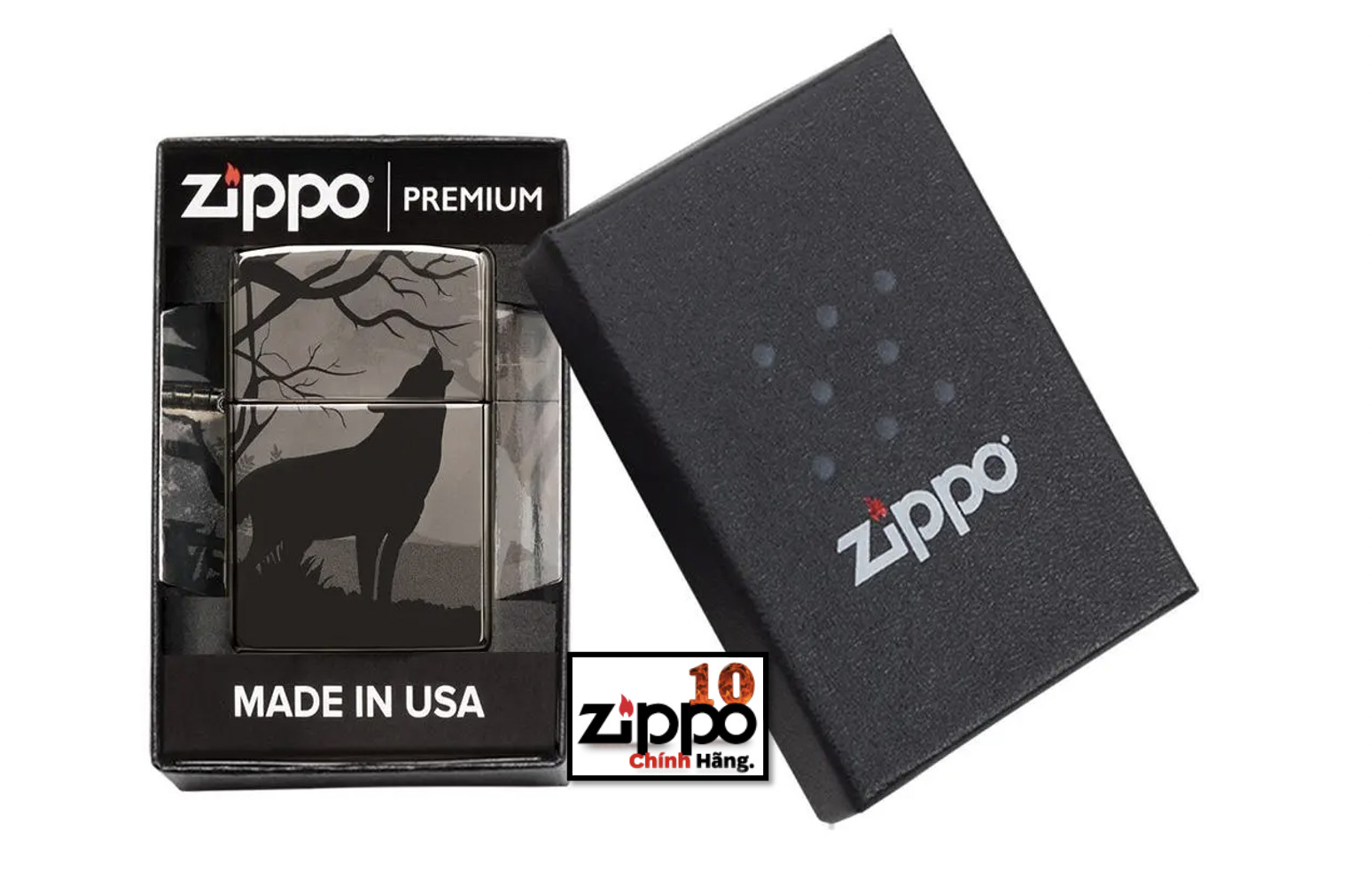 Cho dù bạn là một con sói đơn độc hay một thành viên của một bầy sói thì chiếc bật lửa Wolves mới này chắc chắn sẽ làm thỏa mãn niềm đam mê đó của bạn.Trong khung cảnh tuyệt đẹp này, bạn sẽ tìm thấy hình bóng của một con sói đang hú trong màn đêm ở sâu bên trong một khu rừng tối tăm. Hãy xoay chiếc bật lửa lại, bạn sẽ thấy một con sói khác đang đứng bảo vệ ở phía sau. Hình ảnh này liền mạch xuyên suốt toàn bộ bề mặt của bật lửa Black Ice bằng quy trình Photo Image 360° của Zippo. Được đóng gói trong một hộp đựng dạng quà tặng. Để tối ưu hiệu suất, hãy dùng nhiên liệu bật lửa của Zippo.