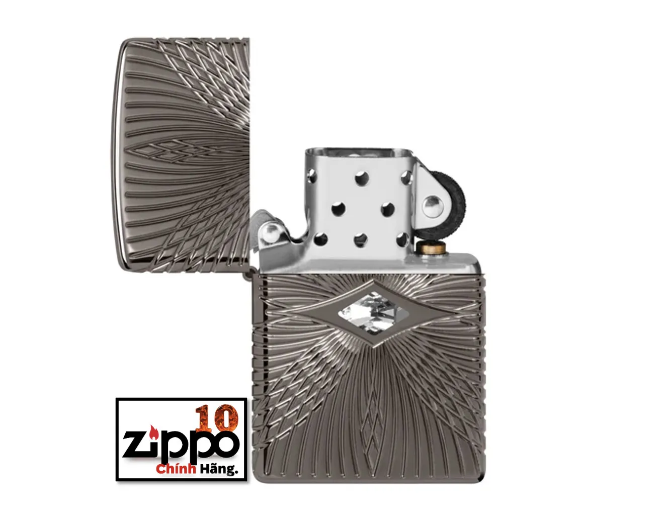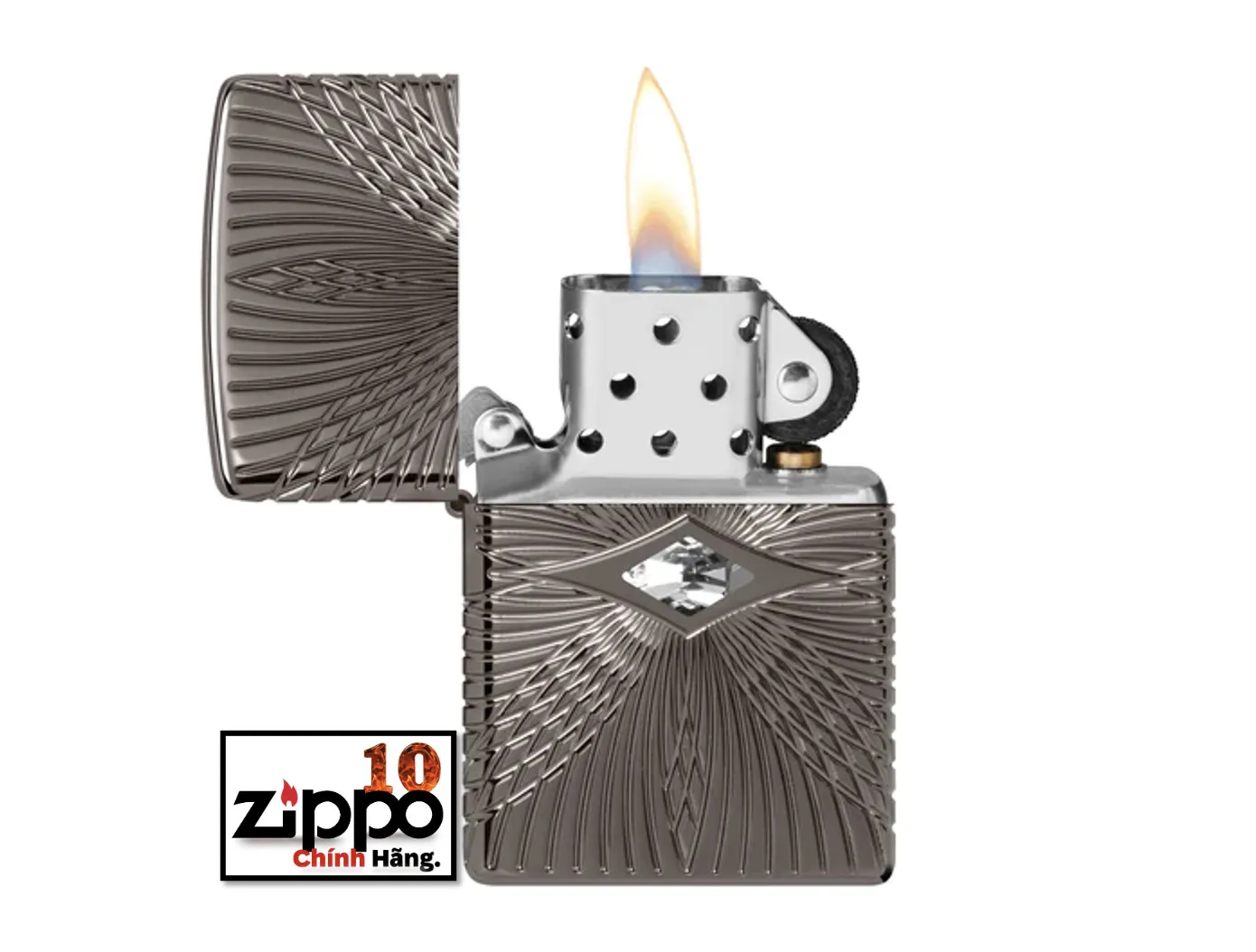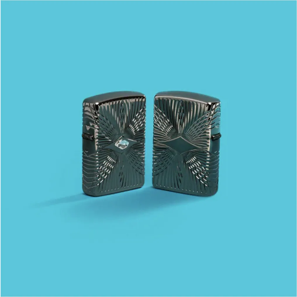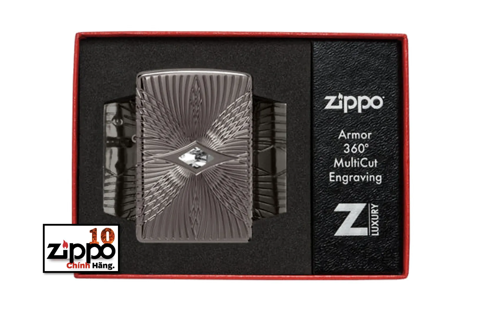 Được bao quanh bởi họa tiết kim cương MultiCut thanh lịch, ba viên pha lê lấp lánh lấp lánh trên bề mặt của chiếc bật lửa Armor Black Ice tinh xảo này. Được đóng gói trong một hộp