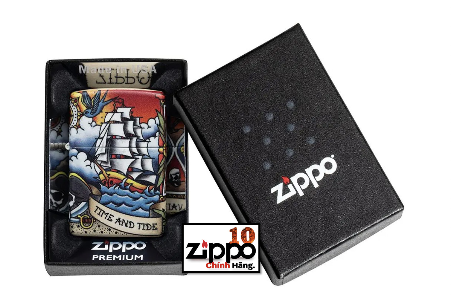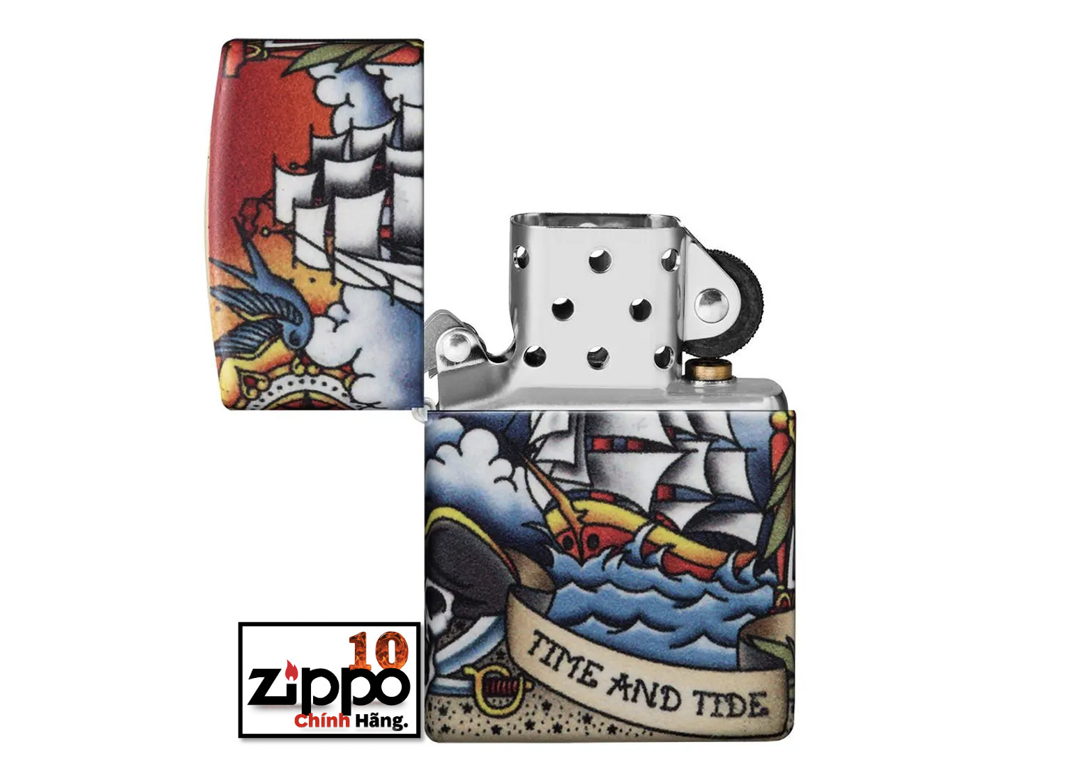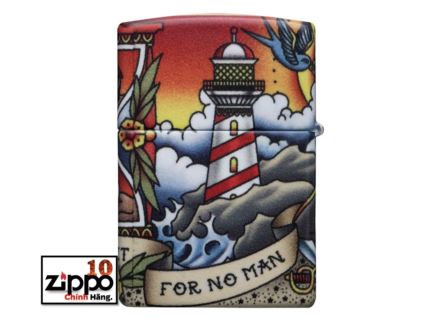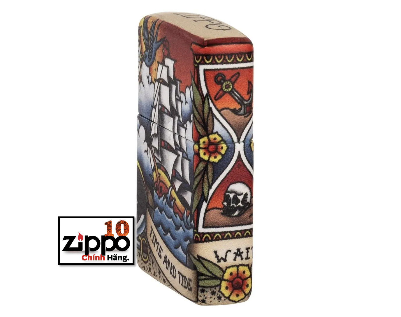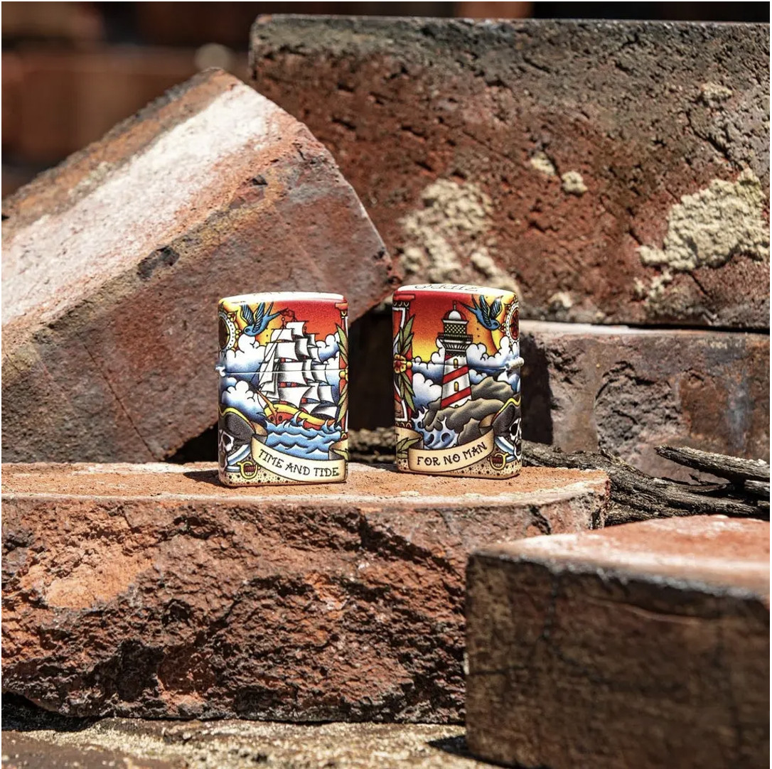 “Thời gian và thủy triều không chờ đợi người đàn ông nào” – Tìm câu nói mang tính biểu tượng này trong một kịch bản bao quanh chiếc bật lửa Thiết kế hình xăm hàng hải cổ điển này. Cho dù bạn là người yêu thích phong cách xăm truyền thống của Mỹ hay thiết kế lấy cảm hứng từ biển khơi, thiết kế này chắc chắn sẽ đưa bạn trở lại thời kỳ của những tiệm xăm cổ điển. Thiết kế này sử dụng quy trình 540 Màu của Zippo, cho phép phủ hoàn toàn bề mặt của bật lửa với các tác phẩm nghệ thuật chính xác. Xuyên suốt thiết kế này là các yếu tố lấy cảm hứng từ hàng hải như con tàu xén buồm ở phía trước và ngọn hải đăng chiếu sáng ở phía sau. Được đóng gói trong một hộp đựng dạng quà tặng. Để tối ưu hiệu suất, hãy dùng nhiên liệu bật lửa của Zippo.