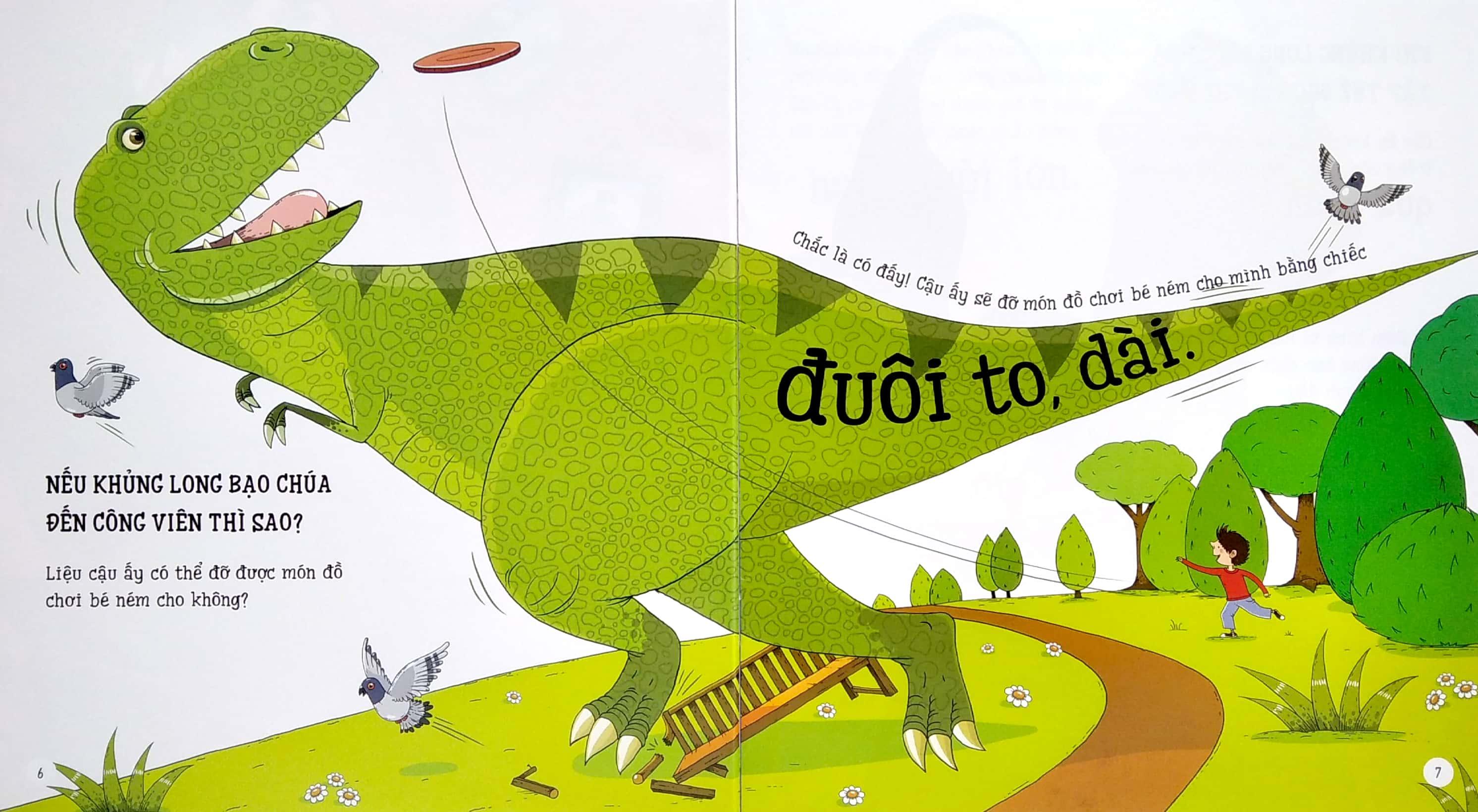 Nế khủng long bạo chúa dạo chơi trong thành phố: Hãy tưởng tượng, nếu khủng long bạo chúa còn sống tới ngày nay, chắc chắn, bé sẽ vô cùng bất ngờ khi phát hiện ra cậu ấy: có thể nuốt gọn 2.000 chiếc bánh mì kẹp thịt, có những chiếc răng to bằng cả quả chuối, có thể nghiền được cả đống rác chỉ trong chớp mắt… Và còn bao nhiêu điều kinh ngạc khác về khủng long bạo chúa đang chờ bé khám phá!