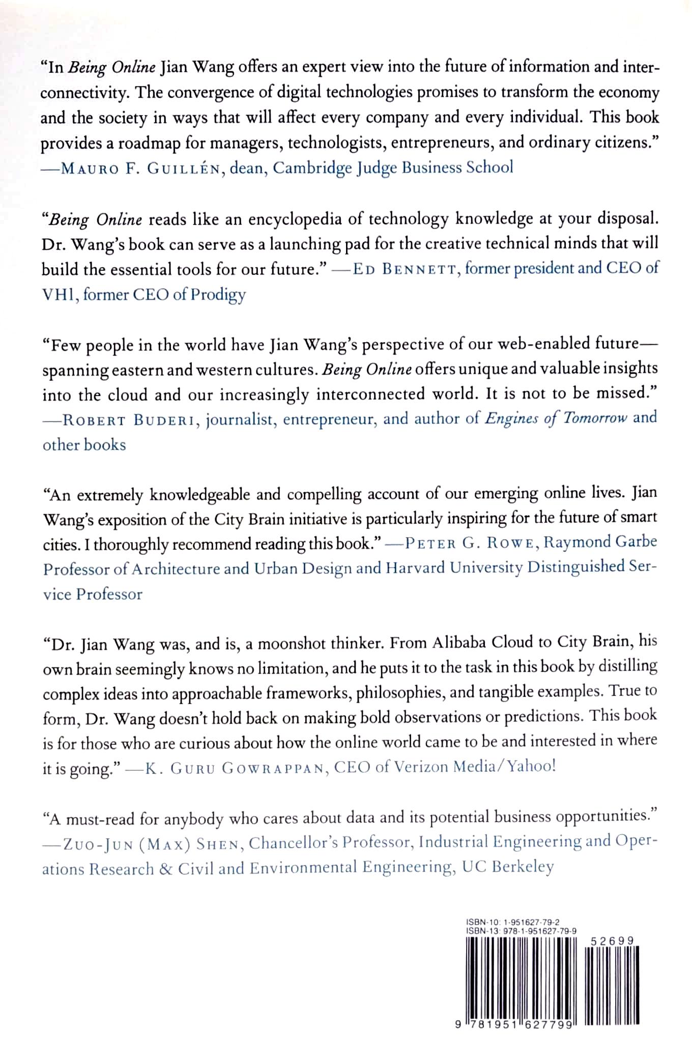 Jian Wang was the founder and architect of Alibaba's cloud and has been the driving force behind its technology innovations. He was also the founder of the City Brain initiative to develop a new digital infrastructure for sustainable cities. Being Online is his meditation on the moment we are in, as the digital era shifts to the internet era, spawning new innovations at a seemingly dizzying pace: cloud computing, 5G, artificial intelligence, big data, wearables, robots, virtual reality, the internet of things, blockchain, and more. For Wang, the invisible hand that connects them is being online. The conjunction of computing, data, and the internet has erased the difference between being online and off. When computing can be done in the cloud, it is on the road to becoming a utility. When data is connected, making it big, its usefulness multiplies exponentially in unforeseeable ways, as does its value.