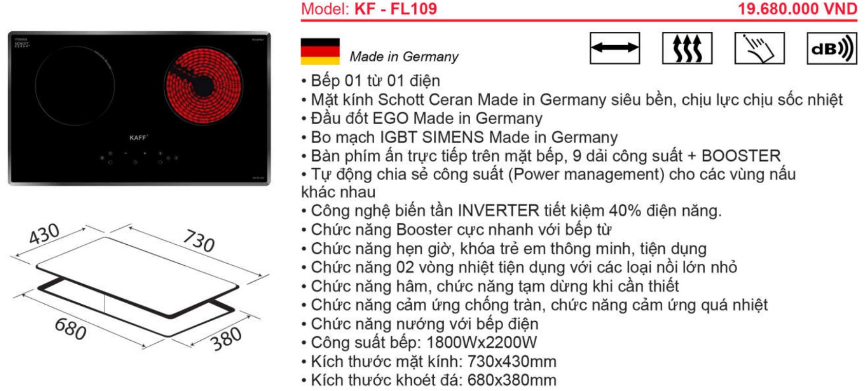 Bếp điện từ kết hợp: 01 điện + 01 từ Mặt kính Shott Ceran Made in Germany siêu bền, chịu lực chịu sốc nhiệt Đầu đốt EGO Made in Germany Chức năng Booster cực nhanh