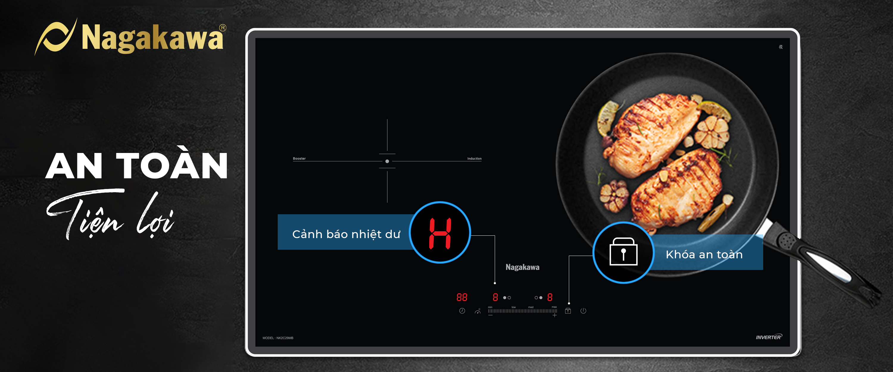 TÍCH HỢP TÍNH NĂNG AN TOÀN VÀ BẢO VỆ THIẾT BỊ VƯỢT TRỘI Bếp đôi điện từ Nagakawa UltraSlim NK2C29MB được trang bị các tính năng thông minh tiện lợi cho người sử dụng, đồng thời giúp nâng cao độ bền của bếp như: Công nghệ chống nhiệt lan tỏa, cảm ứng quá nhiệt, tự động ngắt bếp khi không có nồi đun nấu, dừng hoạt động khi thức ăn tràn xuống bếp, Ngoài ra, bếp còn được trang bị chức năng khóa an toàn, hạn chế sự cố ngoài ý muốn xảy ra nếu như trẻ em vô tình bấm hay nghịch bếp.
