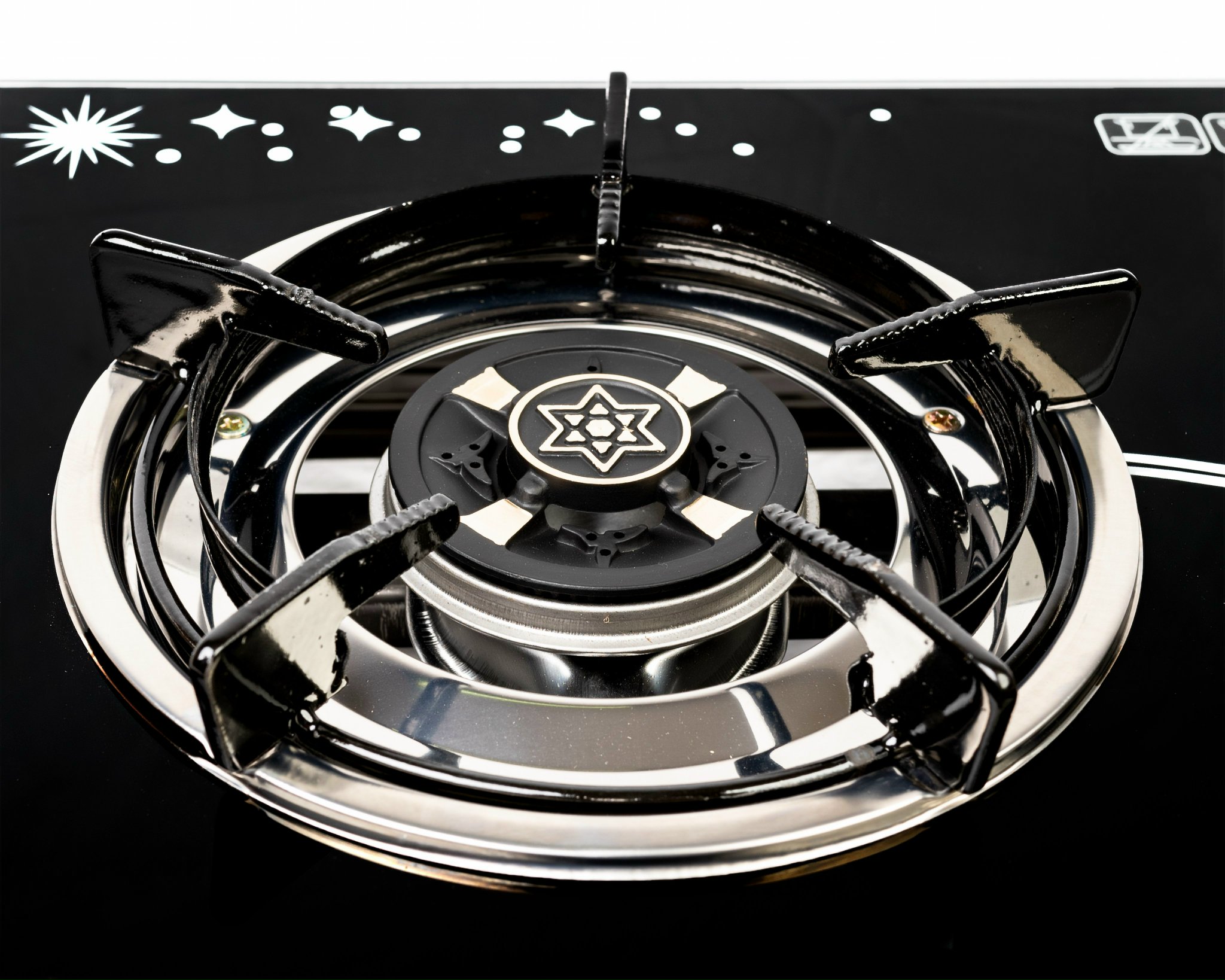 * Mặt kiếng cao cấp chịu lực, chịu nhiệt, thiết kế hoa văn sang trọng; - Thân bếp làm bằng inox chống rỉ sét, cao 60mm; - Núm vặn kiểu Rinnai; - Kiềng thép sơn