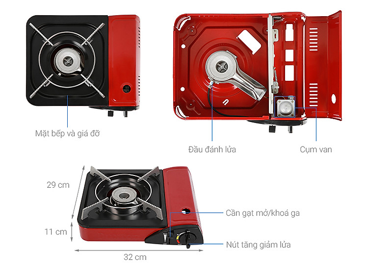 Ưu điểm Bếp gas mini Windo 166s: -Có hộp nhựa đựng tiện lợi - Bếp gas sử dụng cụm van ngắt gas an toàn , ngắt gas trực tiếp từ bên trong theo cơ chế