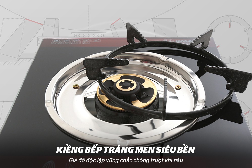 ĐẶC ĐIỂM NỔI BẬT cường lực sáng bóng, dày bền, dễ lau chùi. Kiềng bếp bằng thép tráng men dễ tháo rời vệ sinh. Đầu đốt đồng thau bền bỉ ít bị ăn mòn,