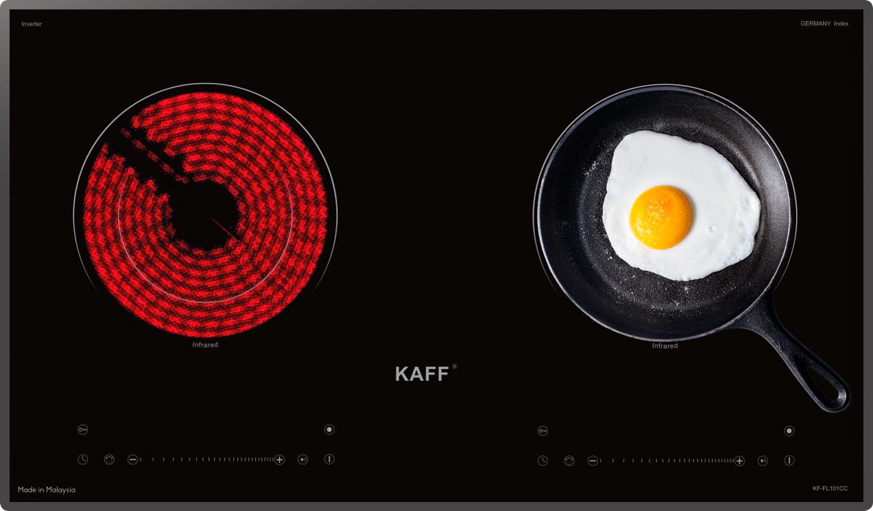 Bếp điện Kaff KF-FL101CC gồm 2 vùng nấu hồng ngoại với tổng công suất là 4400W, vùng nấu hồng ngoại trái trang bị mâm nhiệt cao cấp E.G.O Hilight với 02 vòng nhiệt có công suất tối đa là 2200W, vùng nấu hồng ngoại phải trang bị mâm nhiệt cao cấp E.G.O Hilight với 02 vòng nhiệt có công suất tối đa là 2200W. Bếp hoạt động theo nguyên lí bức xạ nhiệt của tia hồng ngoại, đốt nóng mặt kính và truyền nhiệt qua đáy nồi và làm chín thức ăn bên trong. Nhờ nguyên lí hoạt động này nên bếp hoàn toàn không kén nồi, bạn có thể sử dụng tất cả các loại xoong nồi có sẵn trong gia đình.