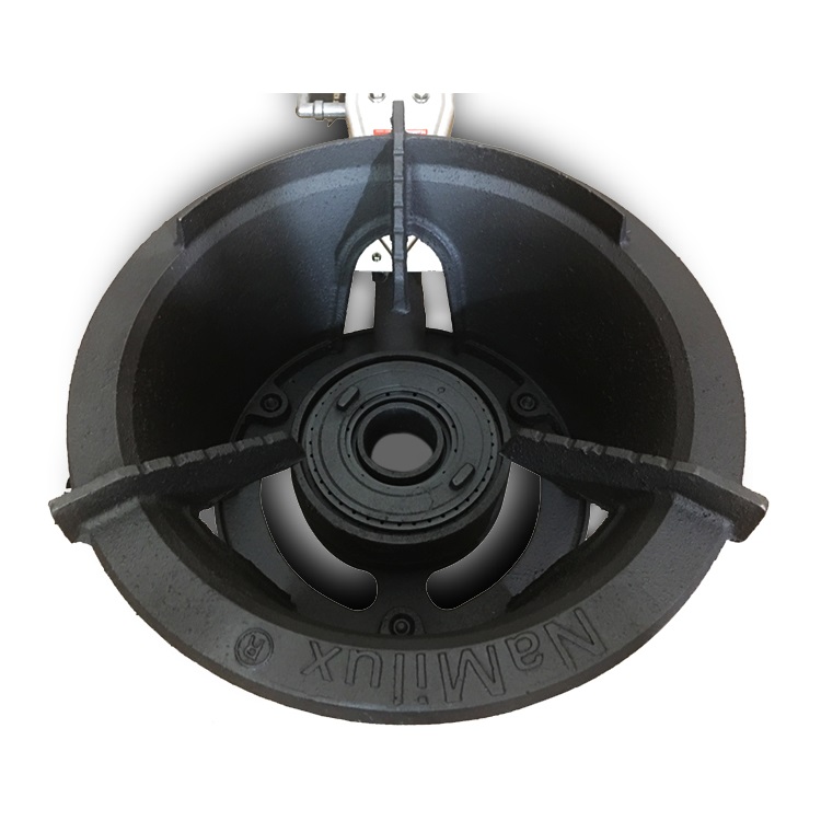 Đầu đốt của bếp khè công nghiệp Namilux bằng gang nguyên khối với các lỗ thoát ga xếp đều chia làm 2 vòng làm cho ngọn lửa tỏa đều khắp đáy nồi, gia tăng nhiệt độ nhanh hơn, nấu chín thức ăn nhanh và tiết kiệm ga