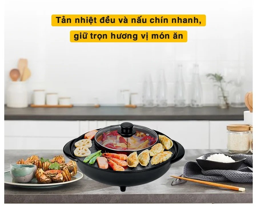 Nồi lẩu nướng điện đa năng 2 trong 1, nướng siêu chống dính cùng với lẩu 2 ngăn tiện lợi