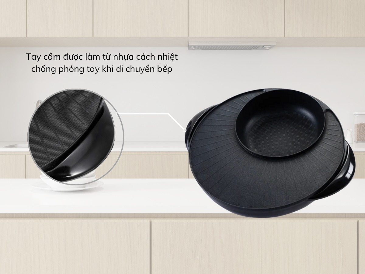 Mô tả sản phẩm: - Khám phá sự tiện lợi với thiết kế 2 trong 1: lẩu và nướng. - Bếp có tay cầm chống nóng, giúp bạn có thể dễ dàng di chuyển bếp