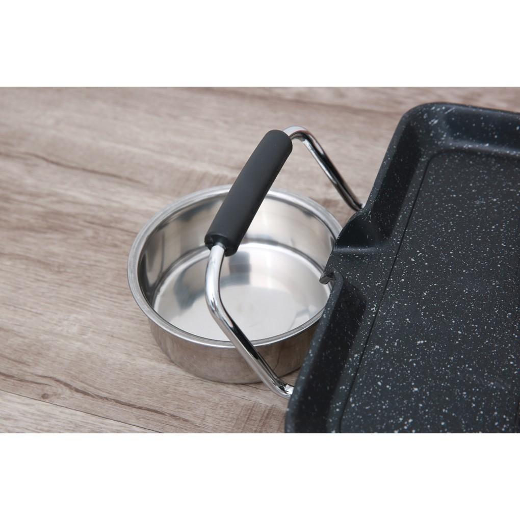 THỐNG SỐ KĨ THUẬT Công suất 1800W Điện áp 220VAC Chất liệu Nhôm phun sơn chống dính Kích thước sản phẩm 565x320x80mm Trọng lượng sản phẩm 2.2 kg Nồi đa năng 2 trong 1: Nướng