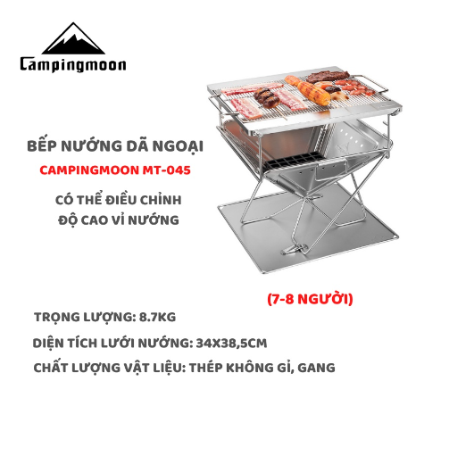 MÔ TẢ SẢN PHẨM BẾP NƯỚNG THAN HOA GẤP GỌN 6-8 NGƯỜI CAMPINGMOON MT-045 * THÔNG TIN SẢN PHẨM: - Thương hiệu: Campingmoon - Mã sản phẩm: MT-045 - Chất liệu: + Lưới nướng: Inox