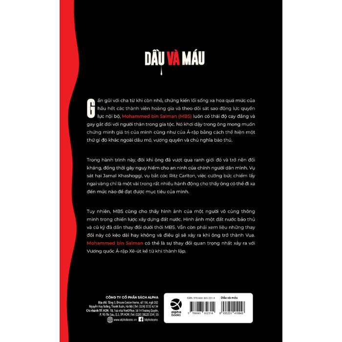 Có lẽ không nhiều người biết đến cái tên Mohammed bin Salman (MBS) cho tới khi cha của ông trở thành Quốc vương Ả-rập Xê-út năm 2015. Từ thời điểm đó, Salman bắt đầu được chú ý và dần trở thành một trong những nhân vật có tầm ảnh hưởng nhất chính trường Trung Đông. MBS đã nổi lên như một nhân vật quyết định, quyết tâm tái thiết nền kinh tế dựa vào các nguồn lực khác ngoài dầu mỏ để đưa Ả-rập Xê-út hội nhập vào nền kinh tế thế giới. Trong cuốn sách Dầu và máu mà các bạn sắp đọc, hai tác giả Bradley Hope và Justin Scheck sẽ khắc họa một cách sâu sắc chân dung của vị thái tử táo bạo và không kém phần lôi cuốn này. Cuốn sách bắt đầu với một cái nhìn tổng quan về Ả-rập Xê-út và vai trò của dầu mỏ trong nền kinh tế và chính trị của quốc gia. Tác giả đã đi sâu vào cuộc hành trình của MBS từ khi ông là Thái tử cho đến các quyết định quan trọng về kinh tế và chính trị mà ông đã đưa ra. Ở một gia tộc đã quá quen với sự xa hoa và hào phóng có được nhờ sự phụ thuộc không lành mạnh vào dầu mỏ, MBS lại là một nhân tố khác biệt. MBS đặt mục tiêu trở thành người thừa kế ngai vàng của Ả-rập Xê-út và khi hai người anh trai của cha ông lần lượt qua đời và Salman trở thành quốc vương vào năm 2015, ông muốn nắm bắt thời cơ và để cải thiện vận mệnh của chính mình, đồng thời theo đuổi tham vọng biến Ả-rập Xê-út trở thành “châu Âu mới”. Vị thái tử với tư tưởng cải cách mạnh mẽ và tân tiến này phải trải qua một quá trình không hề dễ dàng để có thể khiến Ả-rập Xê-út thoát khỏi bệ đỡ quá lớn mang tên dầu mỏ.