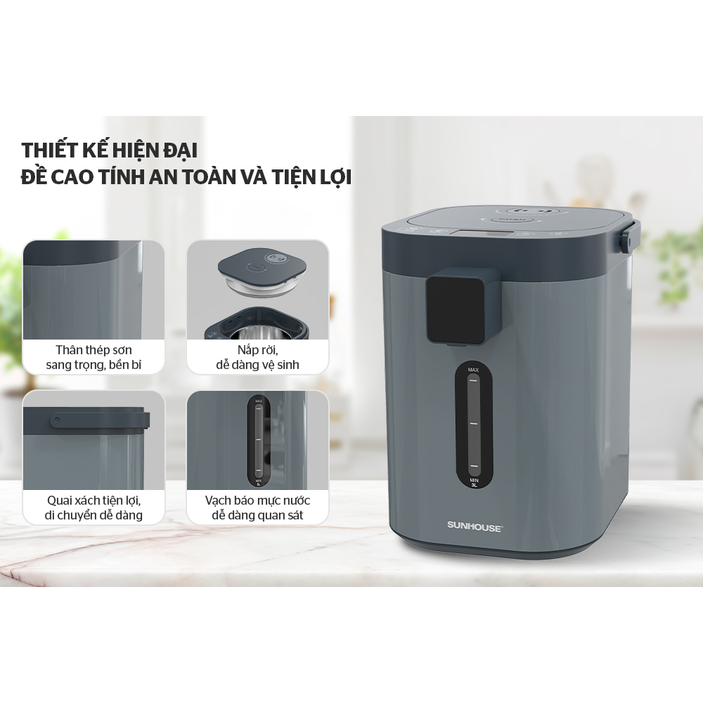 Bình thủy điện Sunhouse SHD1440 (3.2 Lít) có thiết kế hiện đại, kiểu dáng nhỏ gọn, màu sắc trang nhã, phù hợp với mọi không gian. Thân bình làm từ thép sơn bền bỉ, cách nhiệt tối ưu, có quai xách tiện dụng, dễ dàng di chuyển.