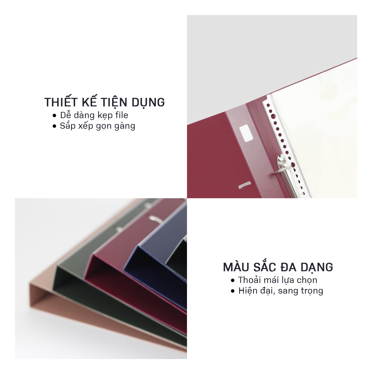 ĐẶC TÍNH NỔI BẬT: - 4 còng chữ O giúp túi tài liệu ngay ngắn (dễ sử dụng, phù hợp với nhiều loại túi 30 lỗ, túi 11 lỗ) - Bìa nhựa PP dày dặn,