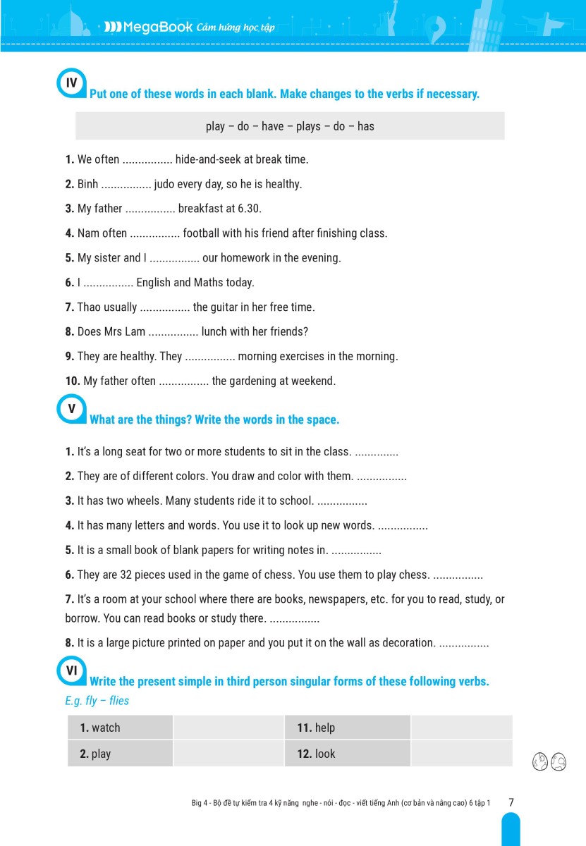 Big 4 bộ đề tự kiểm tra 4 kỹ năng Nghe - Nói - Đọc - Viết TA (cơ bản và nâng cao) lớp 7 tập 1