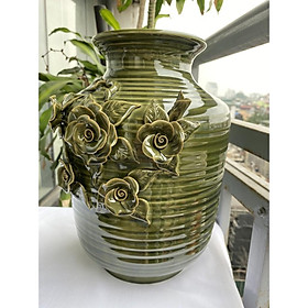 Bình hoa Bát Tràng cao cấp, hàng chuẩn loại 1, men hỏa biến với nước men căng bóng, sáng loáng, mịn màng. Bình màu xanh rêu nổi bật với họa tiết hoa đắp nổi trên