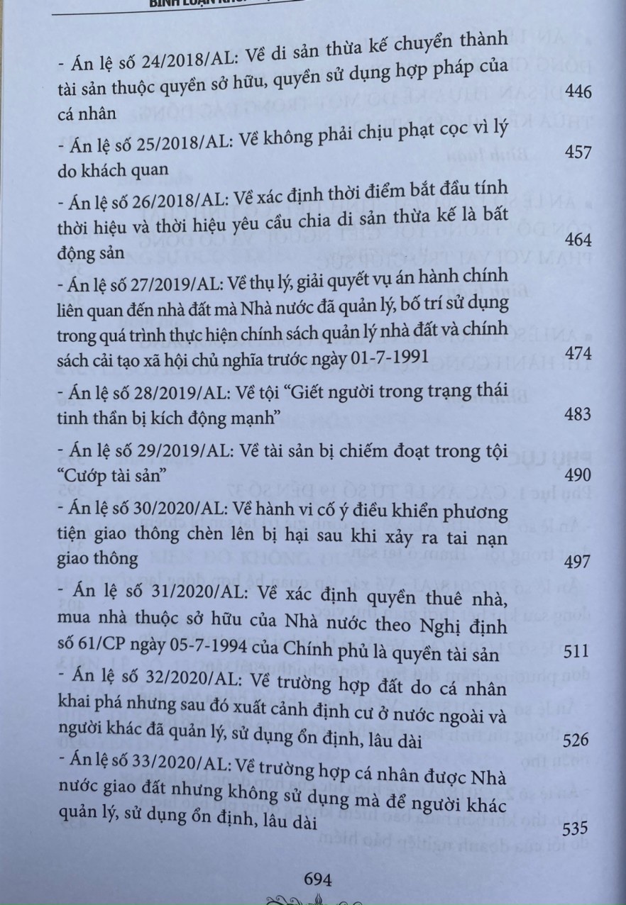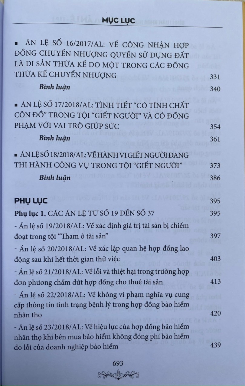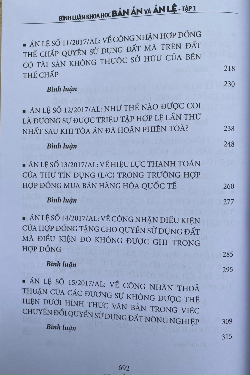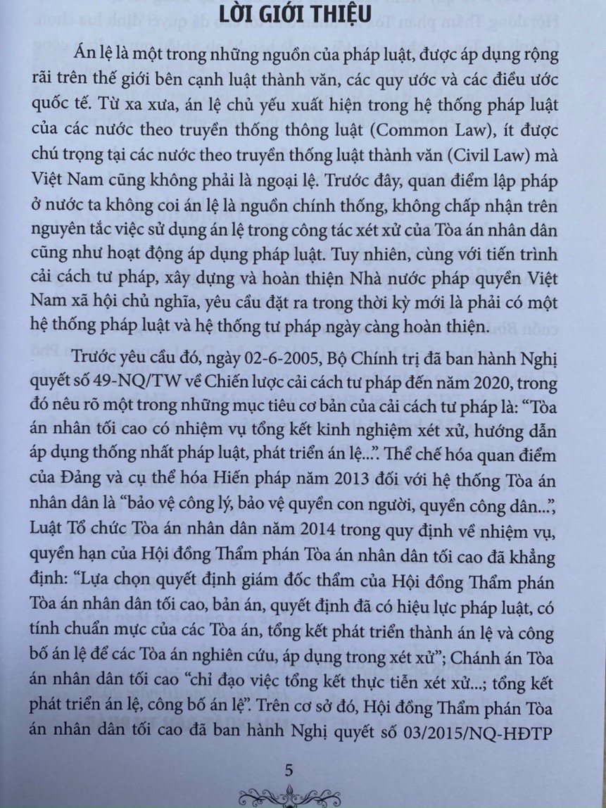Hy vọng cuốn sách sẽ đáp ứng được phần nào nhu cầu của đông đảo bạn đọc, trước hết là các cán bộ trong các cơ quan tư pháp, các luật sư, các nhà nghiên cứu, các giảng viên, sinh viên luậ trong việc tìm hiểu, nghiên cứu, tham khảo, ứng dụng các án lệ đã được công bố; đồng thời, giúp người dân có thêm vốn kiến thức pháp luật về các tình huống tranh chấp được chọn là án lệ, có thể tự bảo vệ quyền và lợi ích hợp pháp của mình một cách tốt nhất .