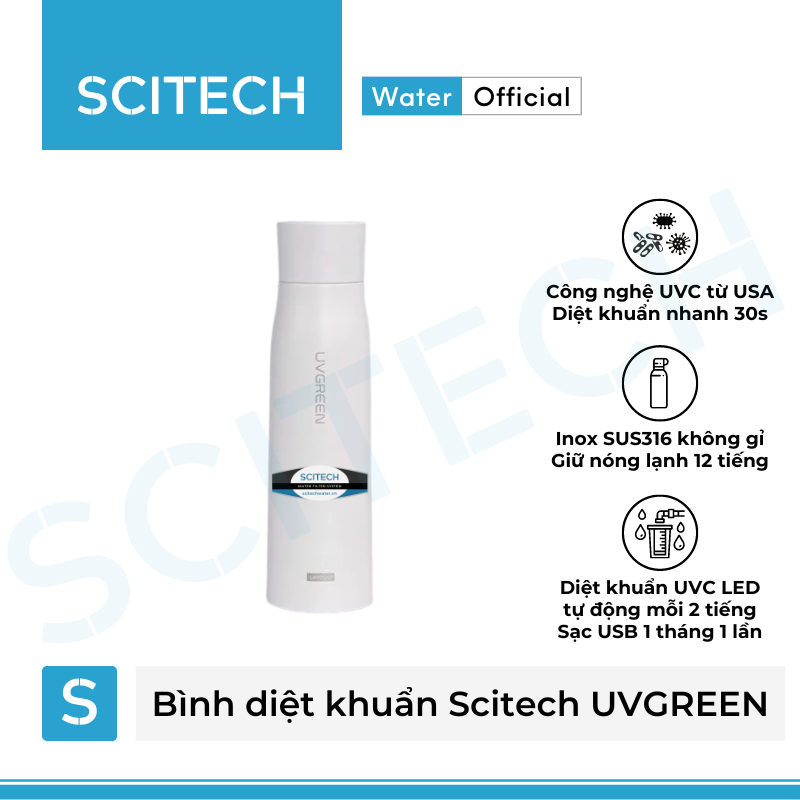 Mua tại TiktokBình nước giữ nhiệt diệt khuẩn Scitech UVGREEN 500ML là dòng bình nước giữ nhiệt kết hợp lọc diệt khuẩn bằng công nghệ UVC LED từ USA. Nước trong bình luôn đảm bảo sạch khuẩn và không có mùi hôi.