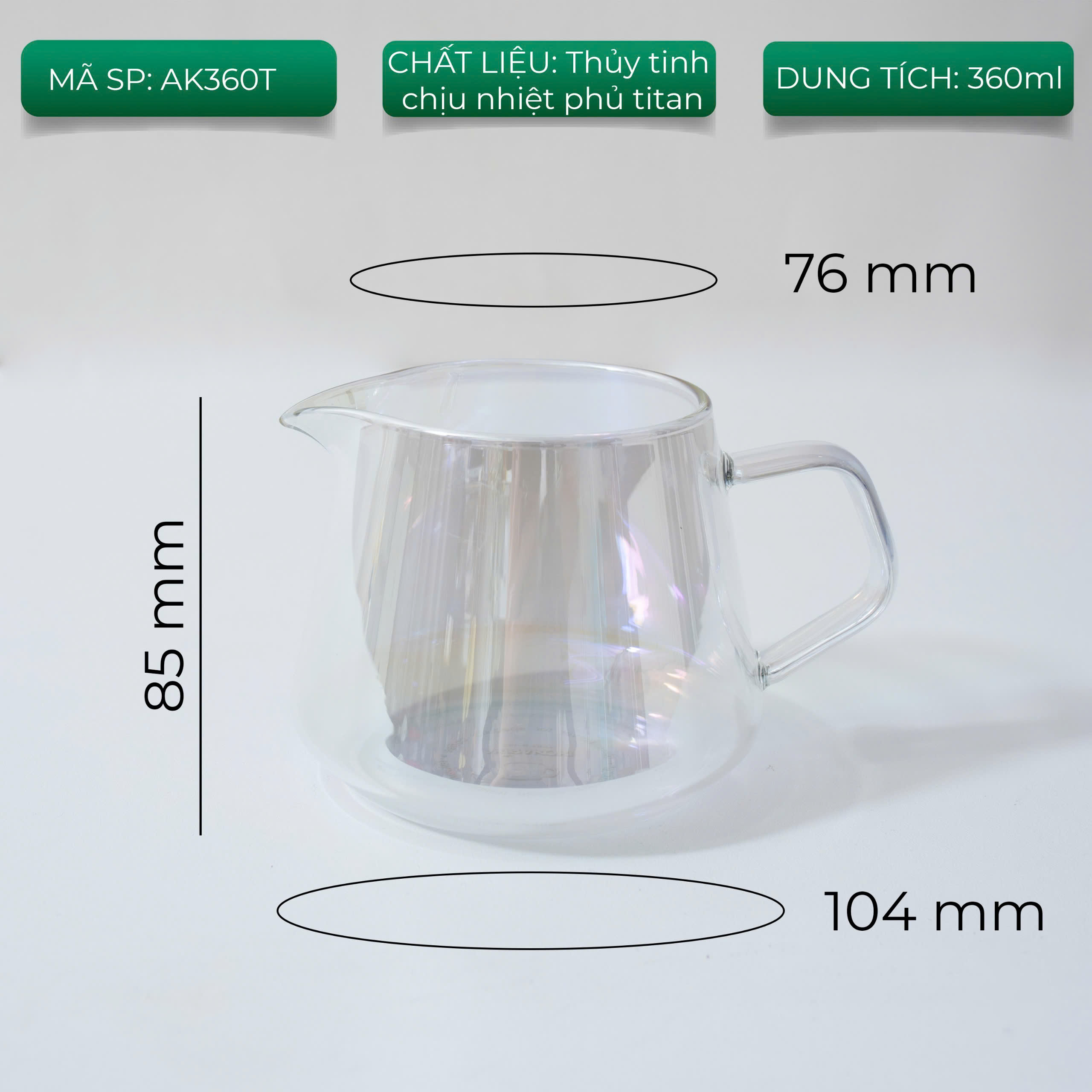 Dung tích: 360ml +Chiều cao:85mm +Đường kính miệng: 76mm +Đường kính đáy:104mm
