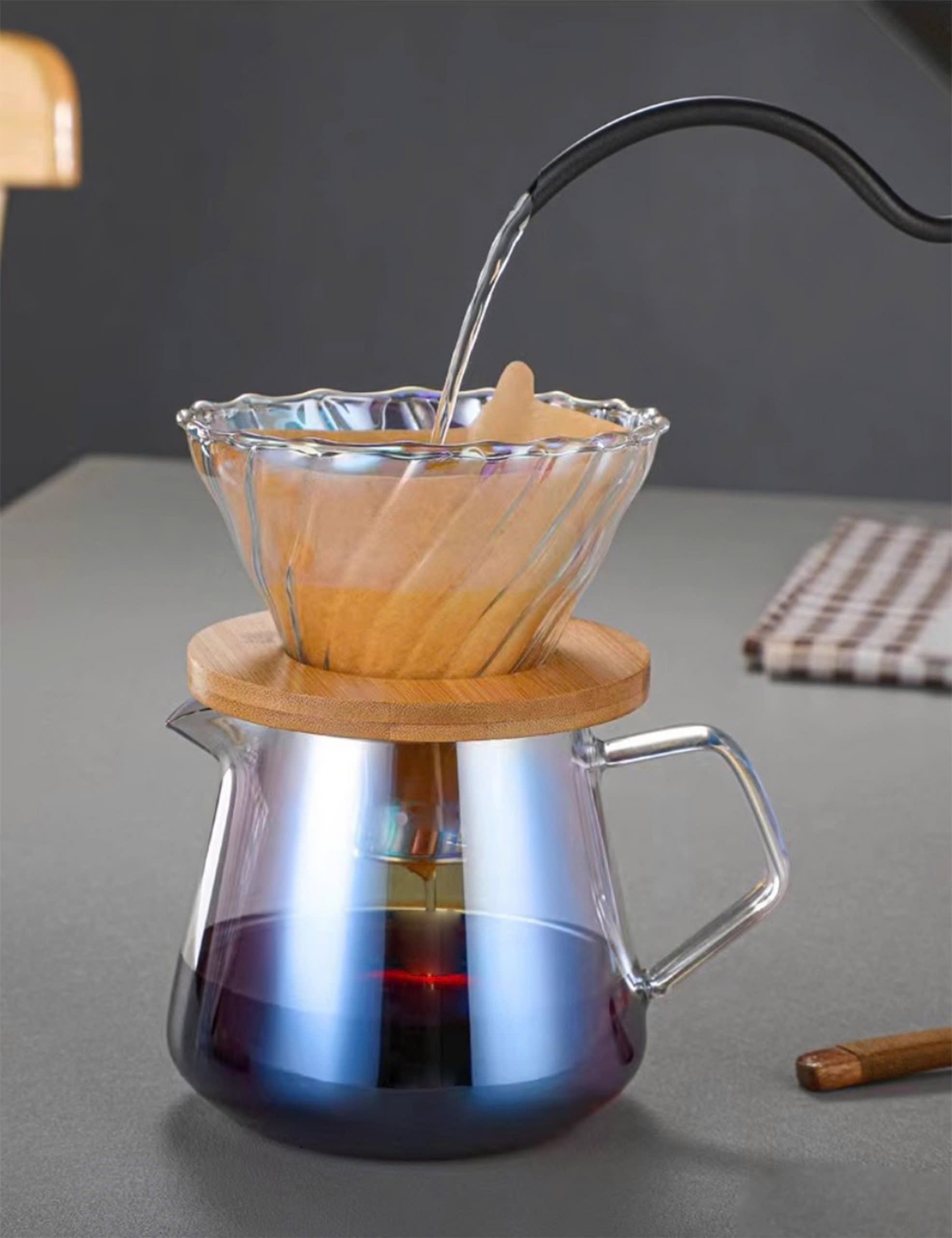 Giới thiệu về Bộ lọc Bình pha cà Pour Over Được làm từ thủy tinh borosilicate chất lượng cao không hấp thụ mùi vị hoặc mùi thơm, carafe có hình dáng đẹp mắt được trang