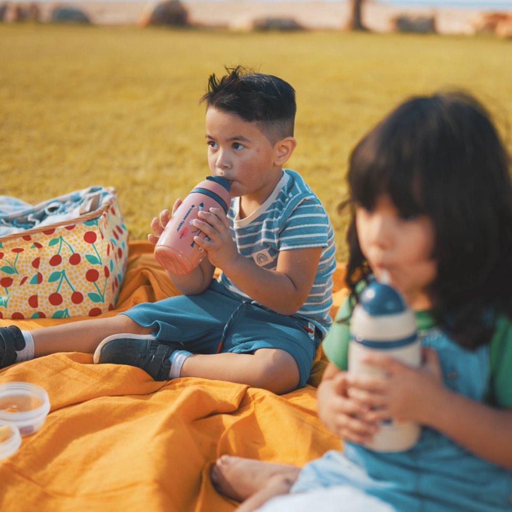 • Cách nhiệt hai lớp: Thân bình cách nhiệt ngăn ngừa sự ngưng tụ hơi nước bên ngoài bề mặt bình và giữ mát cho nước trong thời gian dài, khuyến khích bé uống đủ nước và giữ cho bé mát mẻ trong khi chơi.