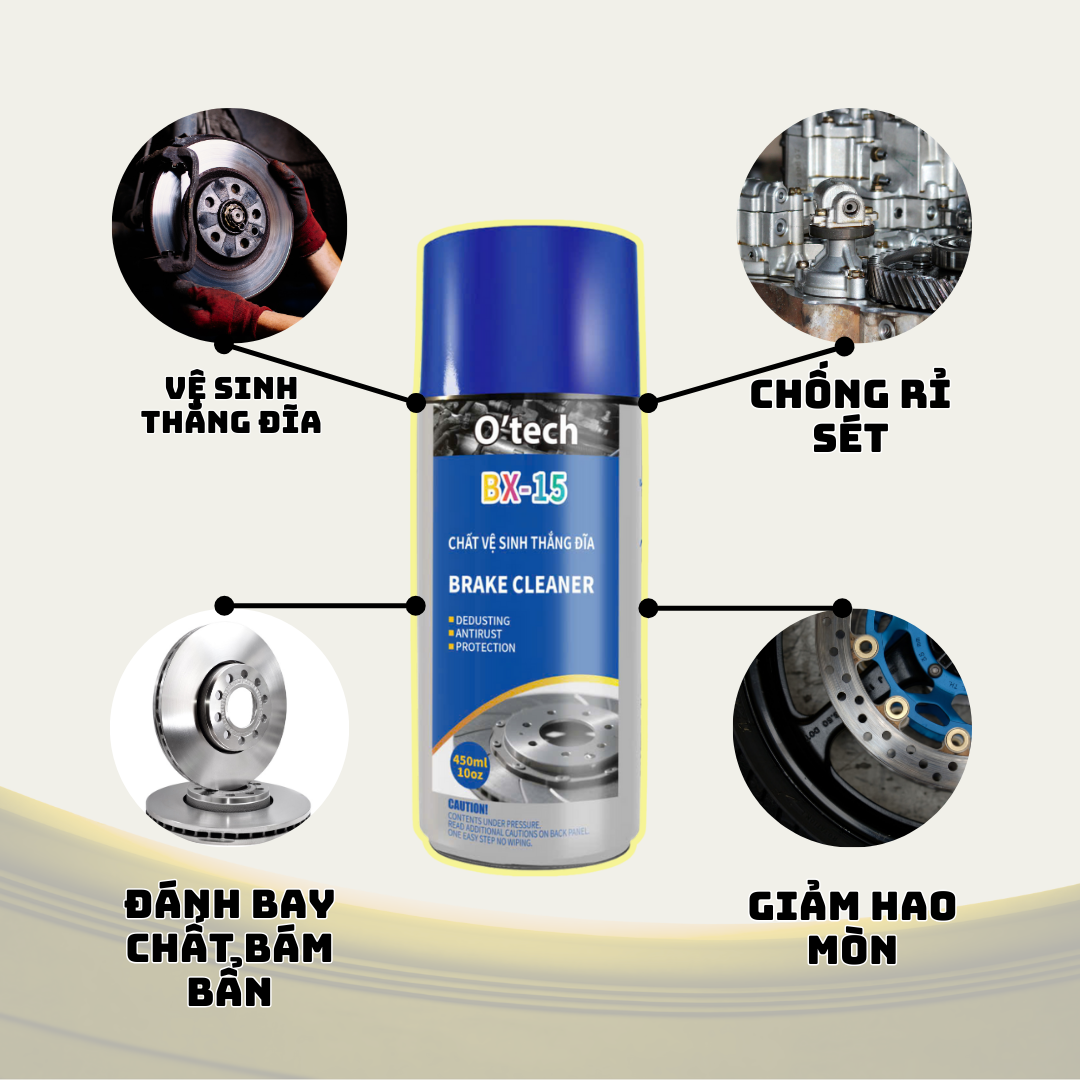 Xịt vệ sinh thắng đĩa O'tech BX-15 là lựa chọn tối ưu để chăm sóc hệ thống phanh của bạn. Với công thức độc đáo, sản phẩm này được sản xuất đặc biệt để loại