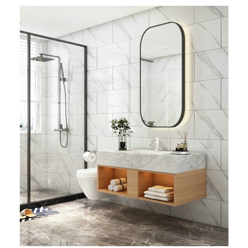 Mẫu giấy dán tường giả đá hoa cương màu trắng này có sẵn keo rồi, khách chỉ cần lột ra dán thôi. Chất liệu bền đẹp, không bám bụi, có thể lau chùi bằng xà