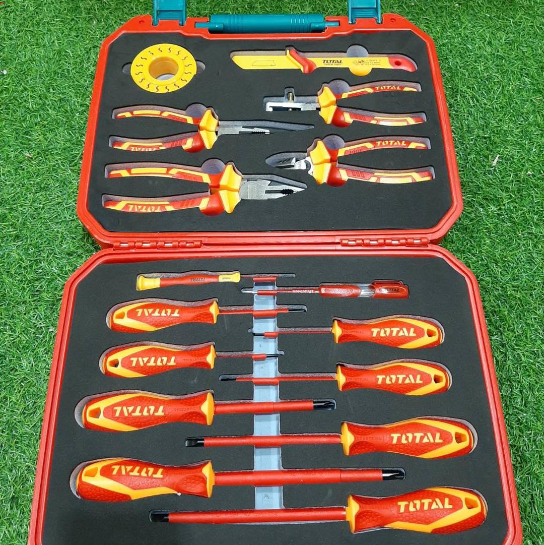 1 Kềm kết răng cách điện 200mm;. 1 kềm mũi dài cách điện 160mm;. 1 kềm cắt chéo cách điện 160mm;. 1 kềm tuốt dây cách điện 160mm;. 1 kềm tua vít cách điện: SL3.0x75mm; SL4.0x100mm;SL5.5x125mm;. 3 Tua vít phillips cách điện: