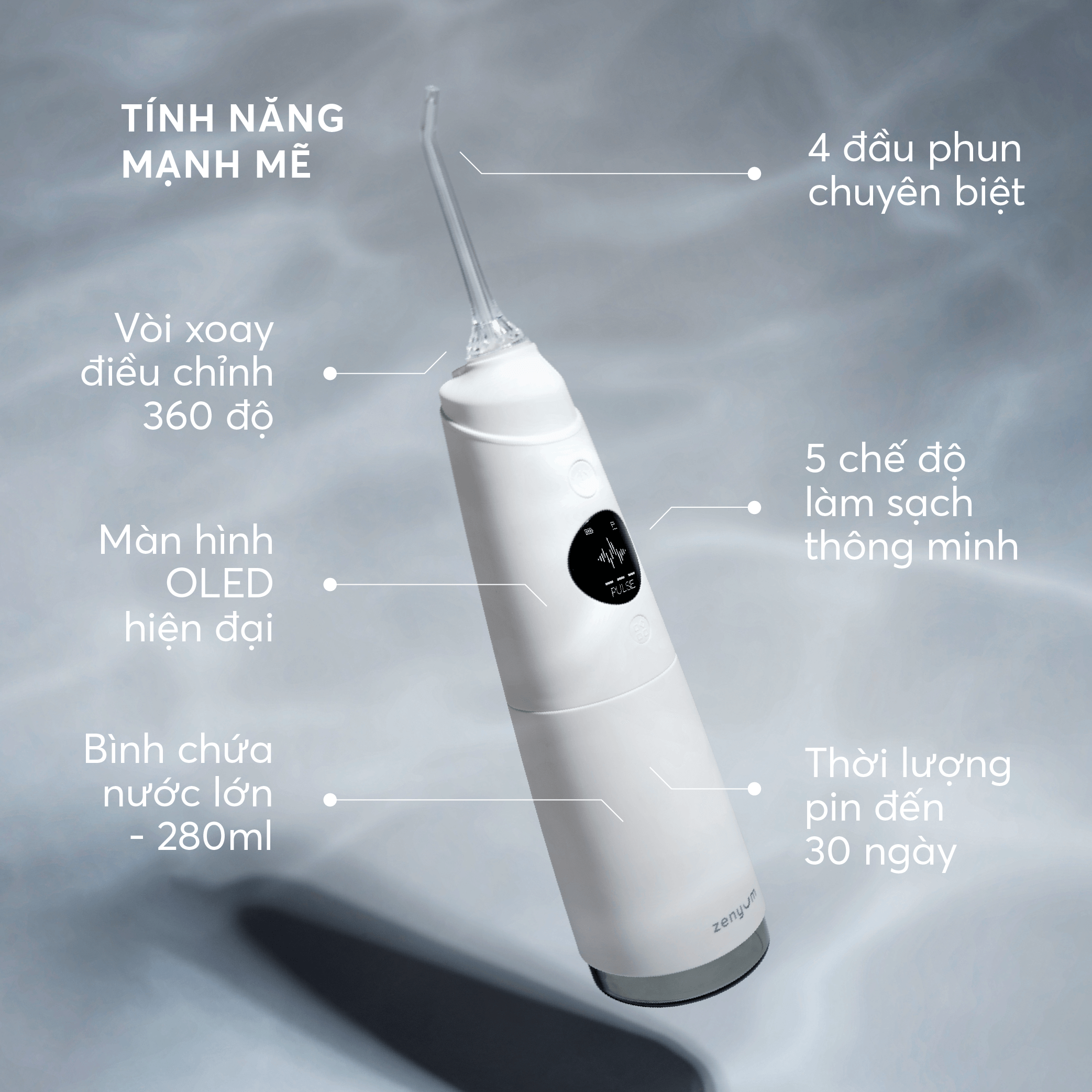 Máy tăm nước Zenyum Pro (Trắng/ Đen)   Sử dụng công nghệ xung động nước tần số cao, tăm nước Zenyum Pro giúp làm sạch thức ăn, mảng bám trong kẽ răng, túi nha chu, là những vị trí mà bàn chải không chạm đến được.    BỘ SẢN PHẨM GỒM: > 2 đầu phun thay thế cho máy tăm nước Zenyum Pro   TÍNH NĂNG:  > Công nghệ xung động nước tần số cao (1400 - 1800 lần/phút). Giúp làm sạch hiệu quả thức ăn, mảng bám trong từng kẽ răng > Khả năng tuỳ chỉnh áp lực làm sạch theo nhu cầu cá nhân > Màn hình OLED cùng 5 chế độ làm sạch, đáp ứng mọi nhu cầu của bạn. Đặc biệt chế độ DIY cho phép tuỳ chỉnh áp lực nước theo nhu cầu của riêng bạn, rất phù hợp cho các bạn có tình trạng răng miệng nhạy cảm.  > Đa năng và linh hoạt với 4 đầu phun chuyên biệt có thể điều chỉnh xoay 360 độ giúp tia nước có thể chạm đến mọi ngóc ngách trong khoang miệng. > Thời lượng pin đến 30 ngày cho 1 lần sạc. > Chống nước IPX7 > Dung tích bình nước đến 280ml, hạn chế phải thêm nước trong quá trình sử dụng. > Bảo hành chính hãng 1 năm.      CÁCH SỬ DỤNG:  > Lắp vòi phun mong muốn của bạn vào thân máy cho đến khi nghe tiếng tạch. > Mở nắp bình chứa và đổ đầy nước. Lưu ý chỉ đổ nước khi máy đang được tắt. Nhấn nút Nguồn để mở máy. > Nhấn nút điều chỉnh chế độ để chọn chế độ mong muốn. Nhấn nhiều lần để đổi qua các mức độ Nhẹ - Trung Bình - Mạnh và chế độ DIY tuỳ chỉnh. > Điều chỉnh hướng của tia nước bằng cách xoay đầu phun. > Giữ máy thẳng đứng để đảm bảo dòng nước chảy dễ dàng từ bình chứa  ** MÁCH BẠN: Để làm sạch tốt nhất, hãy bắt đầu với mặt trong của răng sau đó đến mặt ngoài răng. Di chuyển đầu phun theo đường chân nướu và dừng lại một chút ở từng kẽ răng. Tiếp tục cho đến khi làm sạch cả mặt trong, mặt ngoài, hàm trên và hàm dưới.  CHĂM SÓC KHÁCH HÀNG: Nếu gặp bất cứ vấn đề gì cần hỗ trợ hãy inbox cho gian hàng của Shop ngay nhé!