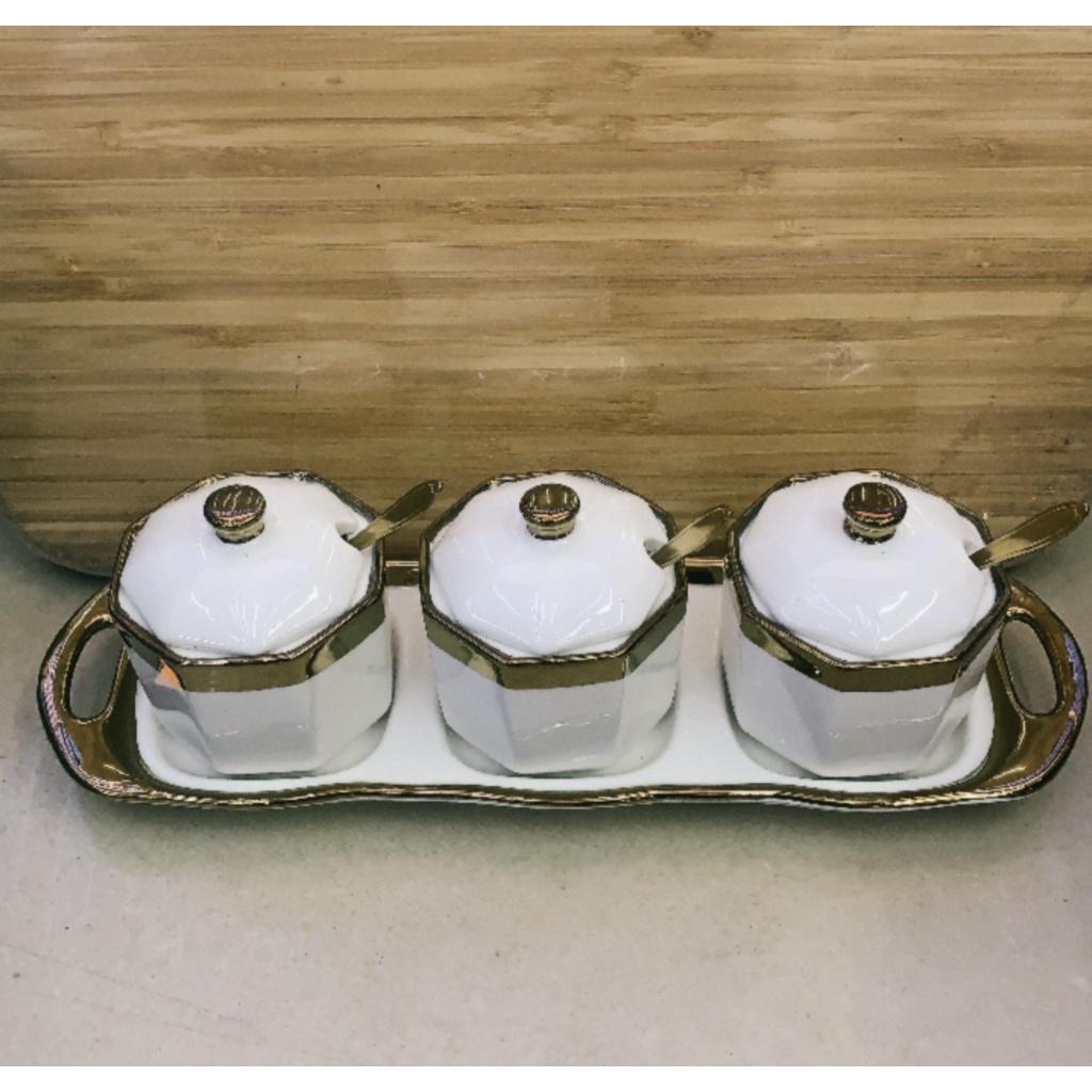Set bao gồm: 1 đĩa, 3 hũ và 3 thìa nhỏ
