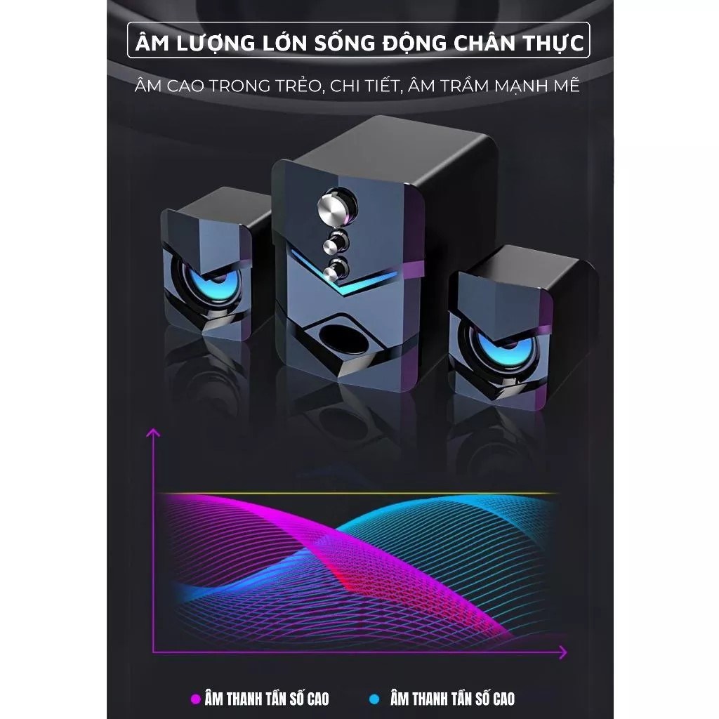 Mô tả sản Phẩm Dòng loa 2.1 kênh thoải mái nghe nhạc, xem phim, chơi game, đèn LED cực đẹp Kết nối đơn giản Âm bass đầy mạnh mẽ, trung thực với tần số