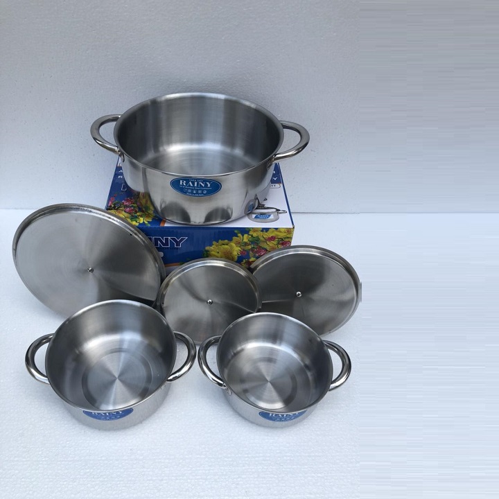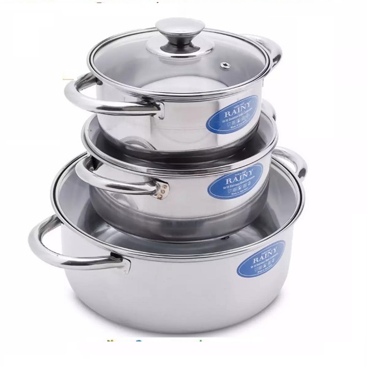 Bộ sản phẩm gồm 3 nồi với các kích thước khác nhau, đường kính nồi lần lượt là: 16cm, 18cm và 24cm. Bạn có thể hầm, nấu nhiều thực phẩm khác nhau để tạo ra những món canh nóng hổi hay món chè ngọt lịm cho cả gia đình. Bộ nồi inox có thể sử dụng trên bếp từ.
