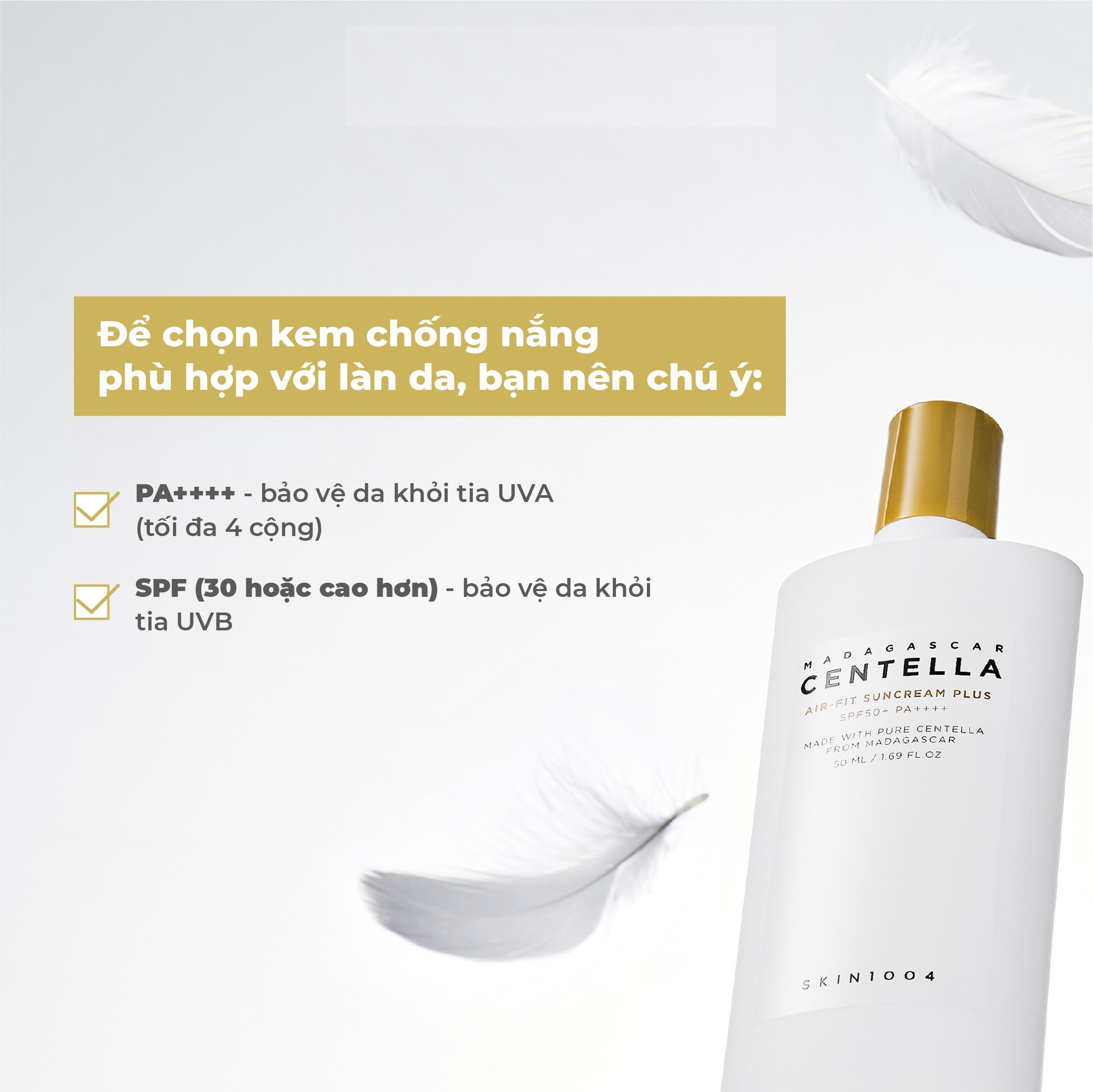 - Kem Chống Nắng Skin1004 Madagascar Centella Air Fit Suncream Plus SPF50 50ml là dòng kem chống nắng phiên bản nâng cấp với nhiều cải tiến vượt trội mang đến khả năng bảo vệ, làm dịu hiệu quả cho mọi loại da. Được thiết kế là dòng kem chống nắng vật lý có màu da để giúp làn da tươi sáng, đều màu hơn và finish hoàn hảo cho da không gây bết dính, khó chịu.