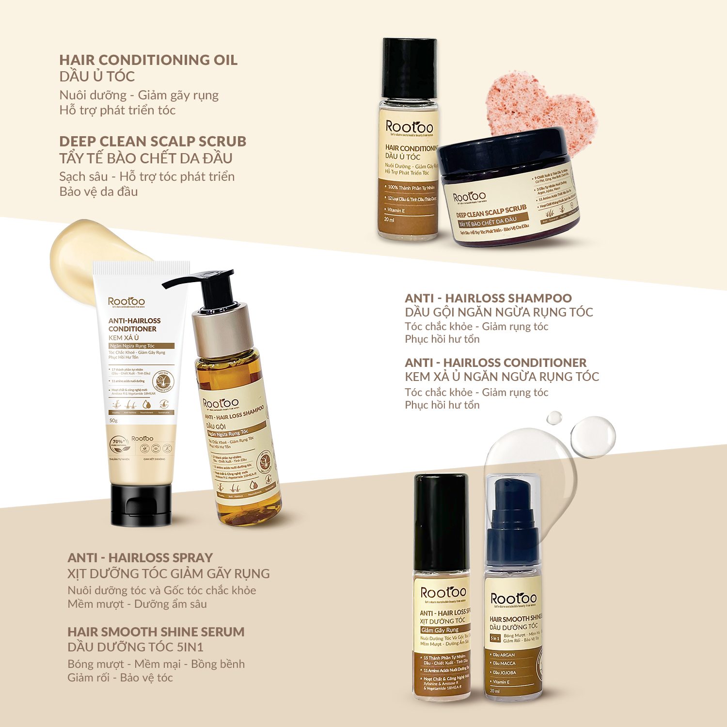 Mua tại TiktokCombo 6 sản phẩm Haircare Collection ROOTOO cho mái tóc bồng bềnh tự nhiên Combo 6 sản phẩm: Dầu Ủ Dưỡng Tóc ROOTOO Thuần Tự Nhiên Giúp Tóc Mềm Mượt, Kích Thích Mọc Tóc Và Phục Hồi Hư Tổn (20ml) Tẩy Tế Bào Chết Da Đầu ROOTOO Thuần Tự Nhiên Giúp Sạch Sâu Da Đầu, Ngăn Ngừa Rụng Và Chống Bết Tóc (50g) Dầu Gội Ngăn Ngừa Rụng Tóc ROOTOO Thuần Tự Nhiên Giúp Kích Thích Mọc Tóc, Giảm Gàu, Phục Hồi Hư Tổn (45ml) Kem Xả Ủ Ngăn Ngừa Rụng Tóc ROOTOO Thuần Tự Nhiên Giúp Dưỡng Ẩm, Mềm Mượt Và Phục Hồi Hư Tổn (50g) Xịt Dưỡng Tóc ROOTOO Thuần Tự Nhiên Giúp Dưỡng Ẩm, Kích Thích Mọc Tóc Và Phục Hồi Hư Tổn (20ml) Dầu Dưỡng Tóc Rootoo Thuần Tự Nhiên Giúp Tóc Bóng Mượt, Mềm Mại, Bồng Bềnh (20ml) THÔNG TIN SẢN PHẨM: