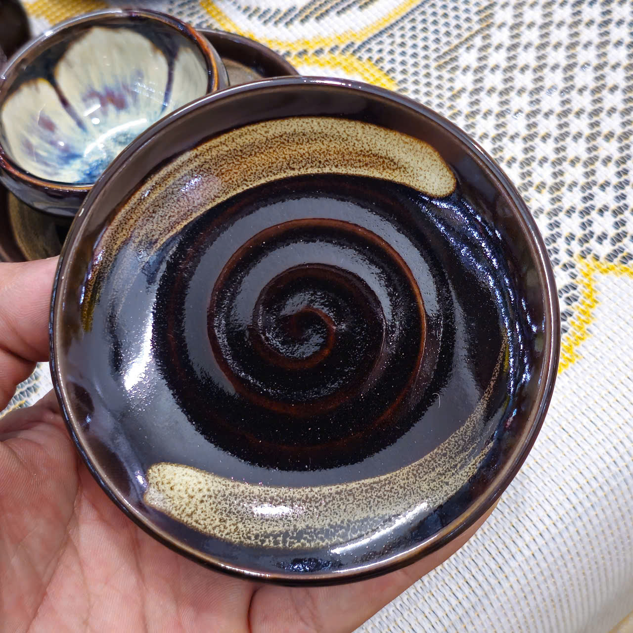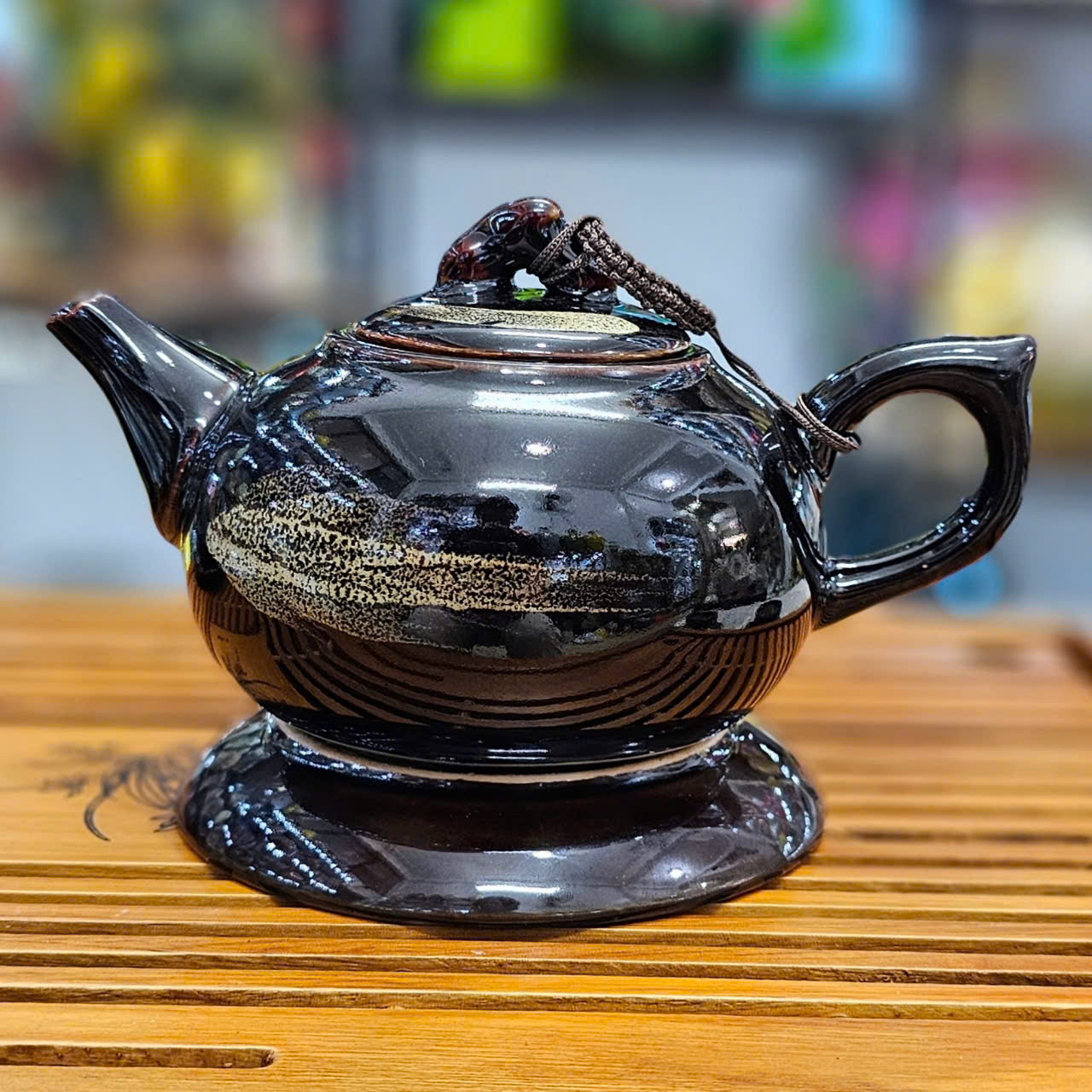 - Đĩa kê được thiết kế thẩm mỹ. Men đen bóng đồng bộ với ấm và chén. Họa tiết được điểm xuyết tinh tế trên đĩa. Tổng thể: