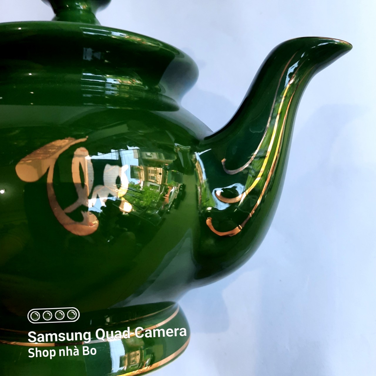 Bộ bình trà ấm chén men xanh ngọc lục bảo vẽ vàng 24k, gốm sứ bát tràng tinh vân, 0986469896,tea pot