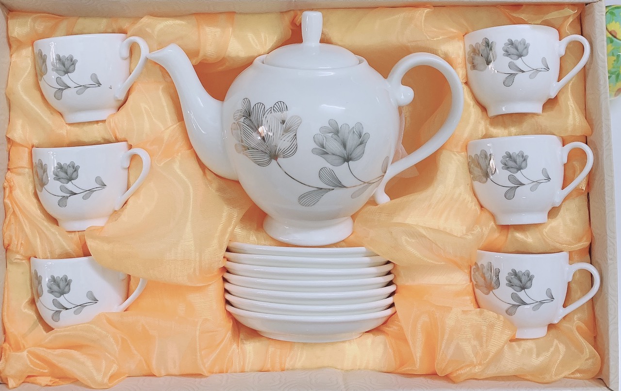 Một bộ sản phẩm bao gồm: 01 ấm, 01 đĩa ấm, 06 chén và 06 đĩa chén. Bộ sản phẩm được làm từ chất liệu gốm cao cấp, bảo đảm an toàn vệ sinh