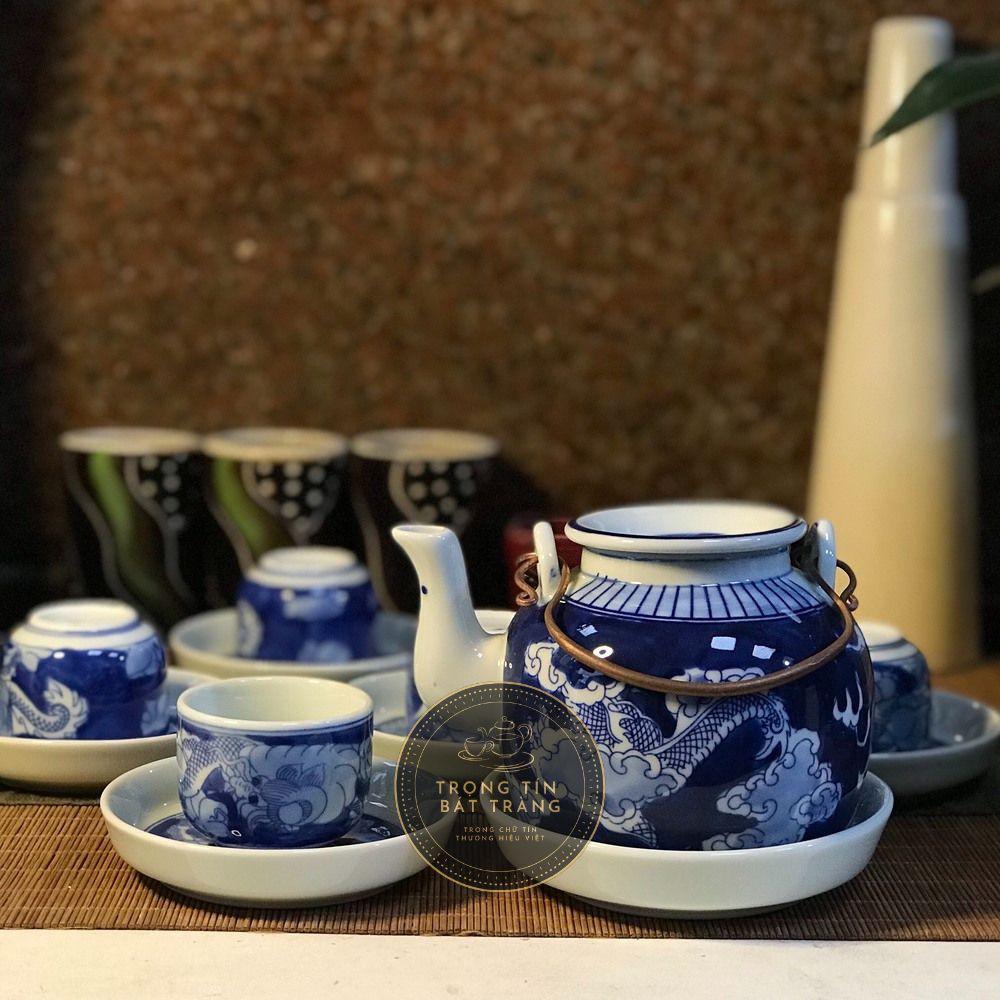 ATA 22 Bộ Ấm Chén Gốm Sứ Men Lam Bát Tràng Họa Tiết Long Ẩn Dáng Đại Bân Đề Lương Dung Tích 480ml
