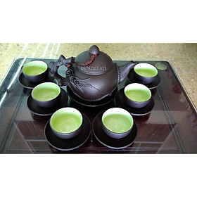 Bộ ấm chén men nâu gồm: 6 chén 1 ấm 7 đĩa. Màu men, nâu, xanh lòng trắng, xanh, dùng để thưởng trà trưng bày nghệ thuật. Sản xuất tại Bát Tràng, đun ở nhiệt