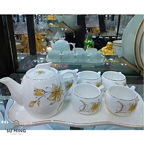Bộ ấm chén được cấu tạo từ gốm sứ cao cấp, mang lại sự tinh tế, sang trọng.