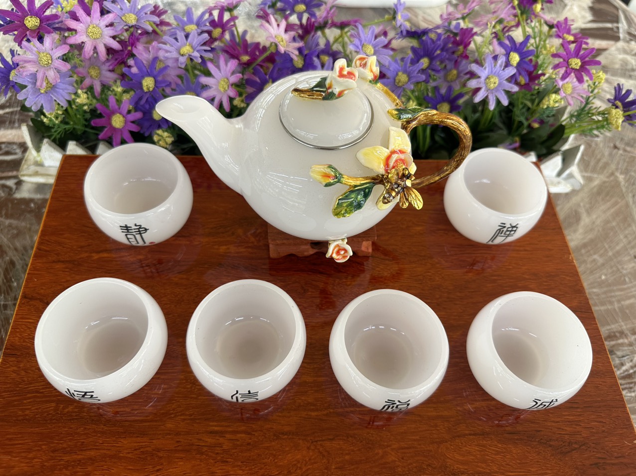 ✨Bộ ấm trà chạm hoa hồng và ong đá bạch ngọc
