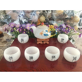 Chất liệu: Đá bạch ngọc Bao gồm: 01 ấm; 06 chén, 1 đế gỗ và hộp đựng cao cấp Kích thước : Dài 36 cm x Rộng 25 cm x Cao 13 cm ( Bao
