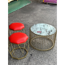 Chất liệu: Bàn mặt kính, đôn mặt nệm da, chân mạ vàng