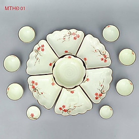 Thông tin sản phẩm: Chất liệu: Sứ Bát Tràng cao cấp Màu men kem, sáng, đẹp. Họa tiết: Hoa Đào đỏ, viền nâu. Bộ đồ ăn Bát Tràng được làm từ chất đất cao cấp,