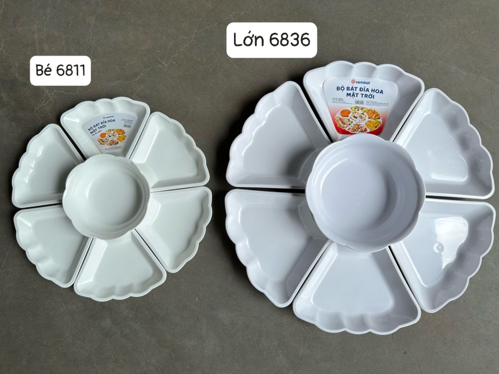BỘ BÁT ĐĨA HOA MẶT TRỜI TRẮNG TÔ HOA 7 CHI TIẾT Gồm: -1 bát tô và 6 cánh đĩa (đường kính cả bộ 54cm) bát tô đường kính 20cm